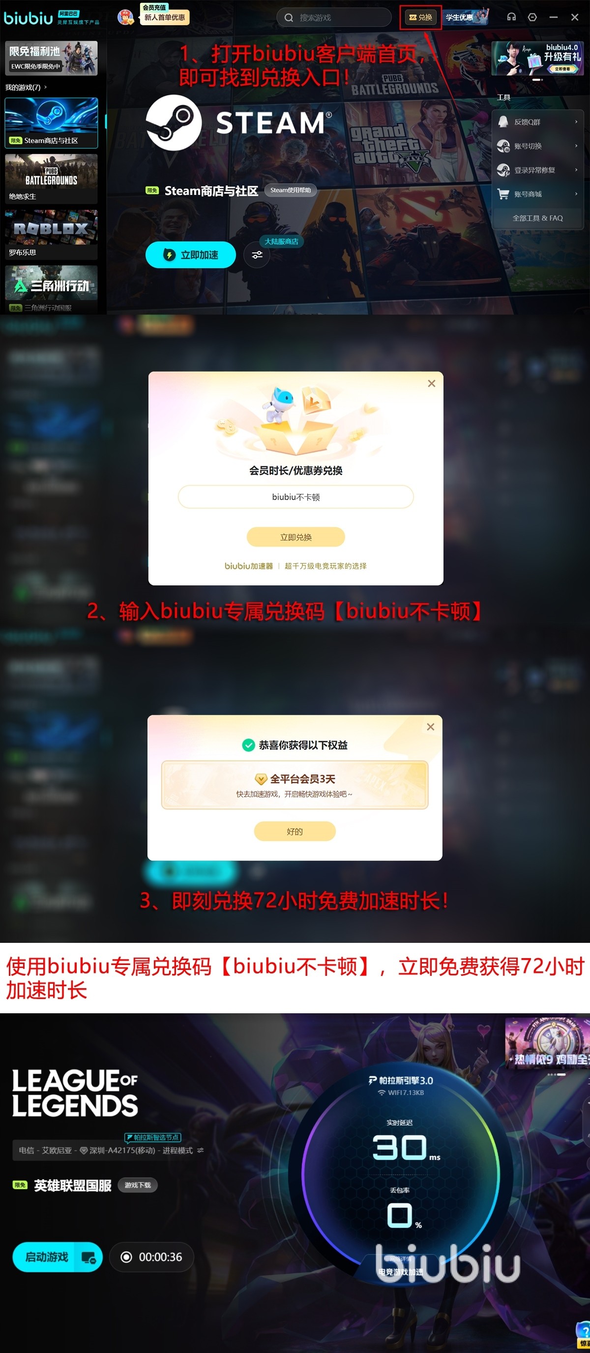 新用户注册后可立即领取24小时免费加速时长;输入专属激活码【biubiu不卡顿】,无论新老用户均可额外获得72小时加速权益。两项叠加,新用户最高可享96小时无限制使用体验。操作极为简洁:登录后搜索“英雄联盟”,选择对应大区(包括国服全大区及国际服主流服务器),点击“一键加速”即可完成部署,全平台兼容性良好。
