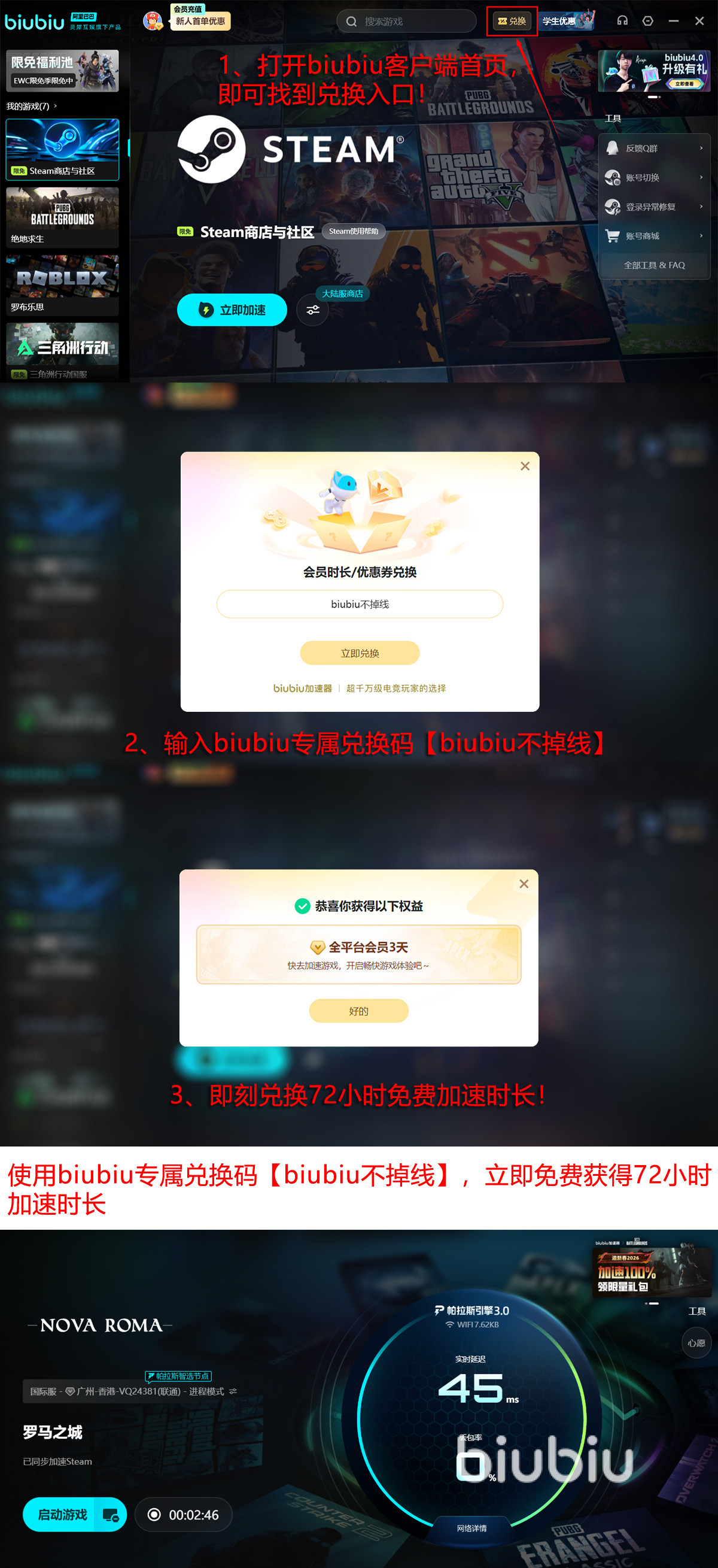 新用户可享专属入门权益:完成注册后立即解锁24小时全功能免费试用权限;额外输入激活码【biubiu不掉线】,还可叠加领取72小时加速时长。两项福利叠加,新用户总计可获得96小时高品质加速服务,充分验证产品稳定性与兼容性。