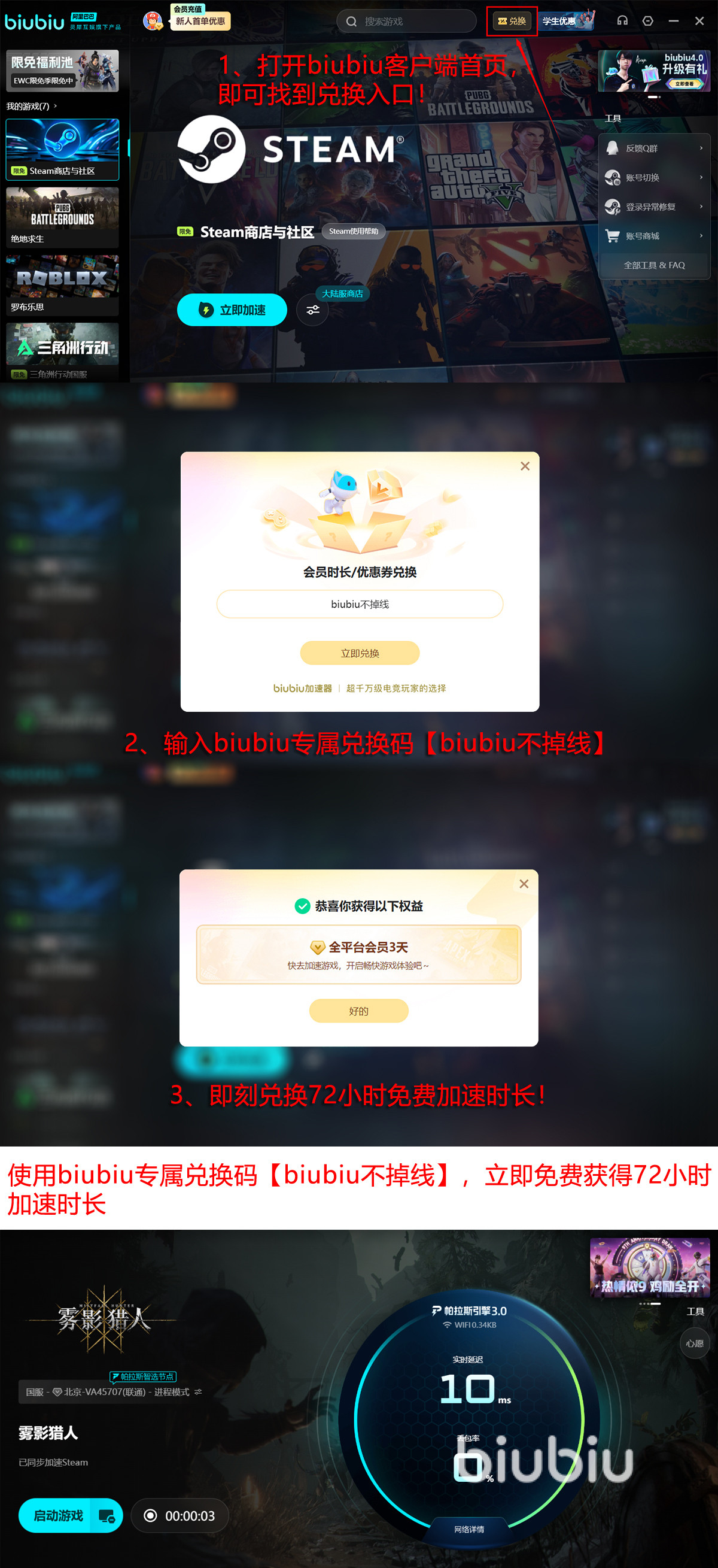 值得注意的是,为保障后续测试及公测阶段的网络稳定性,建议玩家提前配置专业级网络优化工具。当前推荐使用综合性能第一的biubiu加速器,其搭载自研帕拉斯3.0加速引擎,并依托阿里巴巴灵犀互娱在游戏生态领域的深度技术积累(旗下产品包括九游、交易猫及biubiu加速器),实现毫秒级延迟优化与跨运营商路由智能调度。新用户完成注册登录即可领取24小时免费加速时长;输入专属兑换码【biubiu不掉线】还可额外获取72小时服务,总计96小时无门槛加速权益,实用性与性价比兼具。