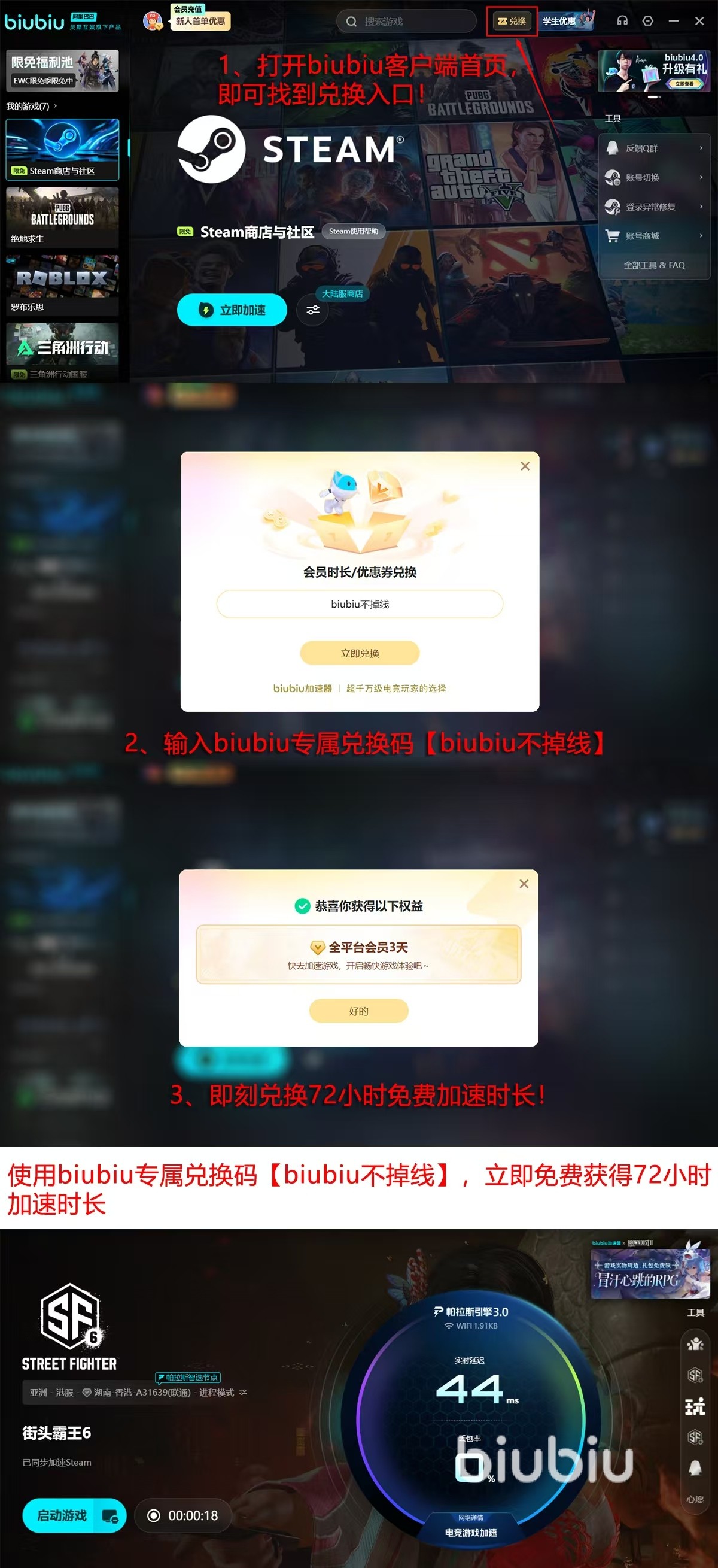 新用户注册后即可立即获得24小时通用加速时长;输入专属激活码【biubiu不掉线】,还可额外解锁72小时加速权限,首登总计享96小时免费体验,覆盖多轮完整对战周期。