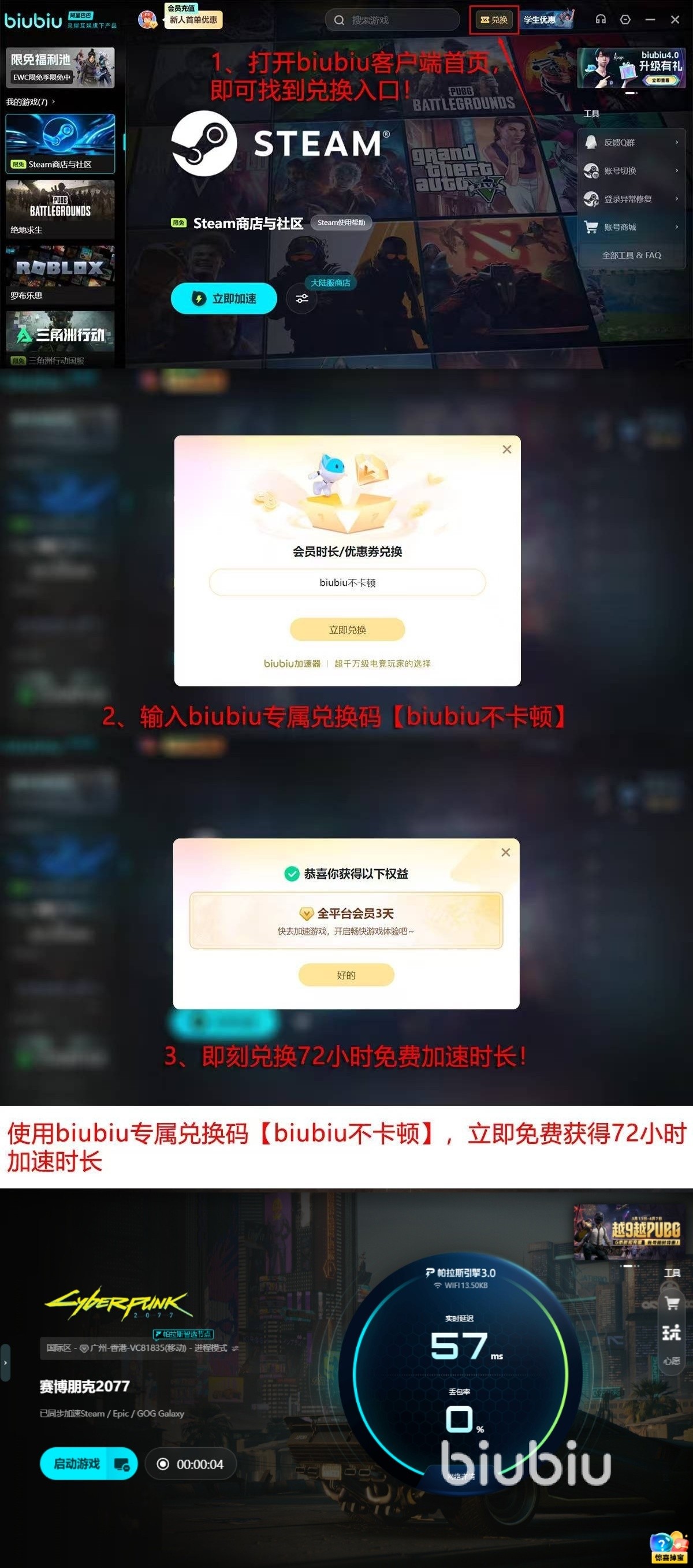 新用户注册即享24小时全功能试用权限;输入激活码【biubiu不卡顿】可额外获得72小时加速时长,累计免费使用时长达96小时。该权益覆盖全部CDPR官方服务器区域,无需手动切换节点。