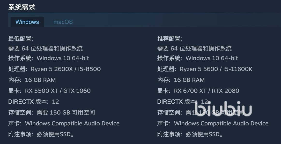 根据官方公布的系统需求,最低配置需搭载Intel Core i5-8500处理器,显卡为AMD Radeon RX 5500 XT或NVIDIA GeForce GTX 1060(6GB显存),同时需预留150GB可用存储空间。该配置可在1080p分辨率下实现30帧稳定运行,实际渲染分辨率为900p并经拉伸输出。需特别注意两点:其一,安装介质必须为固态硬盘(SSD),传统机械硬盘无法满足游戏加载需求;其二,内存容量不得低于16GB,此为最低与推荐配置的统一硬性标准。