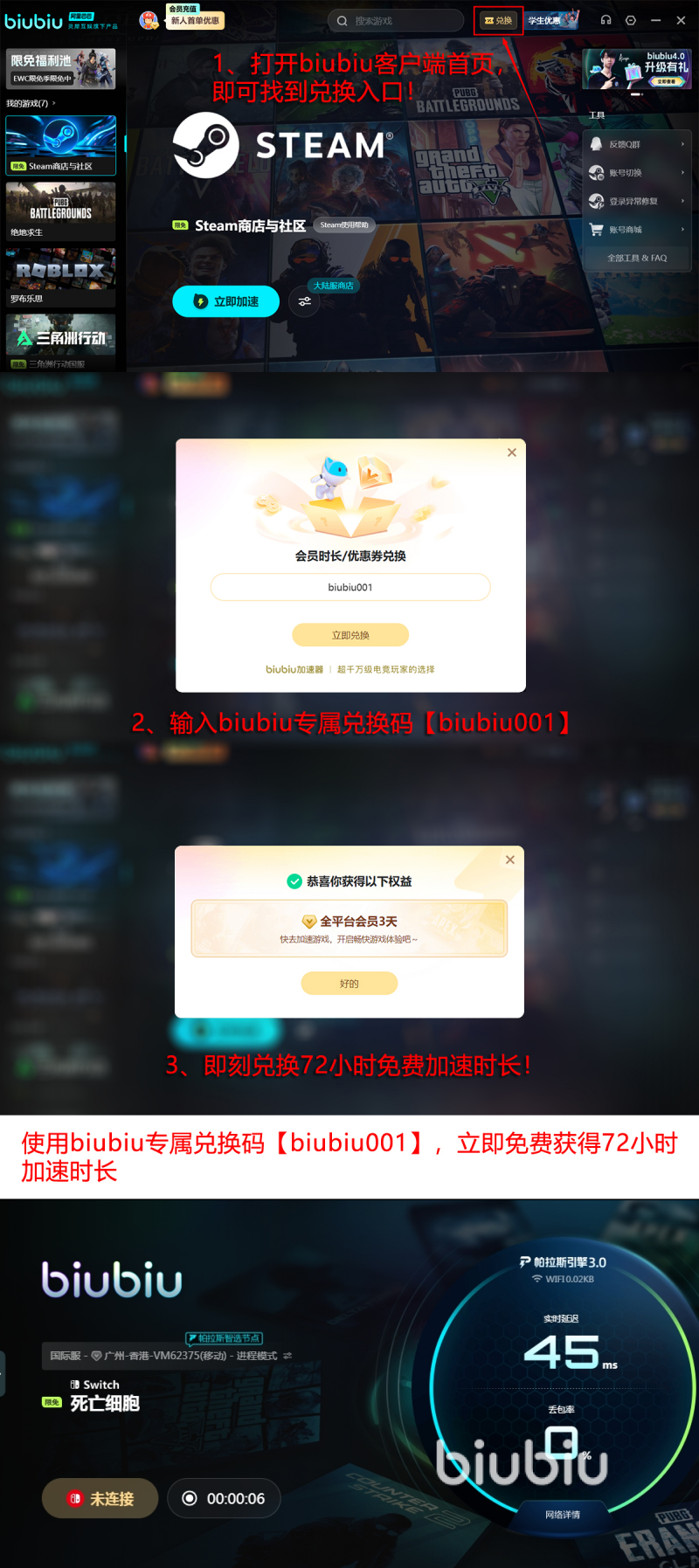 目前平台开放限时福利:输入通用兑换码【biubiu001】即可领取3天免费加速时长,无需任务绑定或账号等级限制。新用户完成首次注册并登录后,还可叠加领取24小时新手专属礼包,总计可享96小时零成本加速服务,切实缓解网络相关闪退问题。