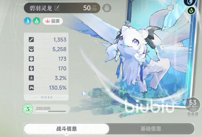 碧羽灵龙属性组合为水与木,当前处于成熟期阶段,幼年形态名为宝蓝雏龙。“碧灵激流”为其核心技能,向指定方向连续释放两道水系激流,合计造成1058.4%攻击力的水元素伤害;当自身生命值高于75%时,该技能伤害额外提升18%。