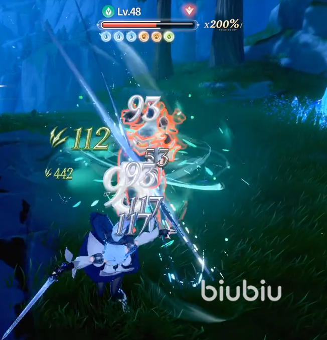 二技能为范围持续输出技,向前方矩形区域连续发射叶片,对范围内敌人造成总计371%木属性攻击力的伤害。