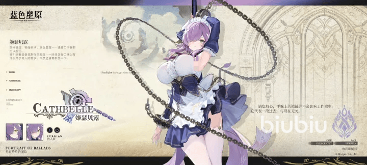 姬瑟贝露为弗利斯代表性角色之一,拥有淡紫色长发与蓝白配色女仆装束,整体气质典雅细腻;其双手佩戴大型金属镣铐,全身缠绕粗重锁链,形成鲜明的视觉张力与性格隐喻。