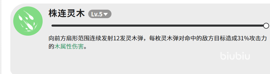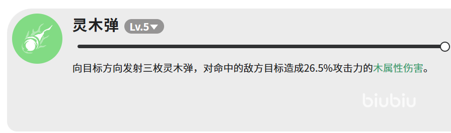 “灵木弹”作为基础输出手段,向指定方向投射三枚灵木弹,每枚造成26.5%攻击力的木属性伤害,合计约79.5%攻击力输出。技能释放频率较高,适合衔接其他技能、维持稳定伤害节奏。