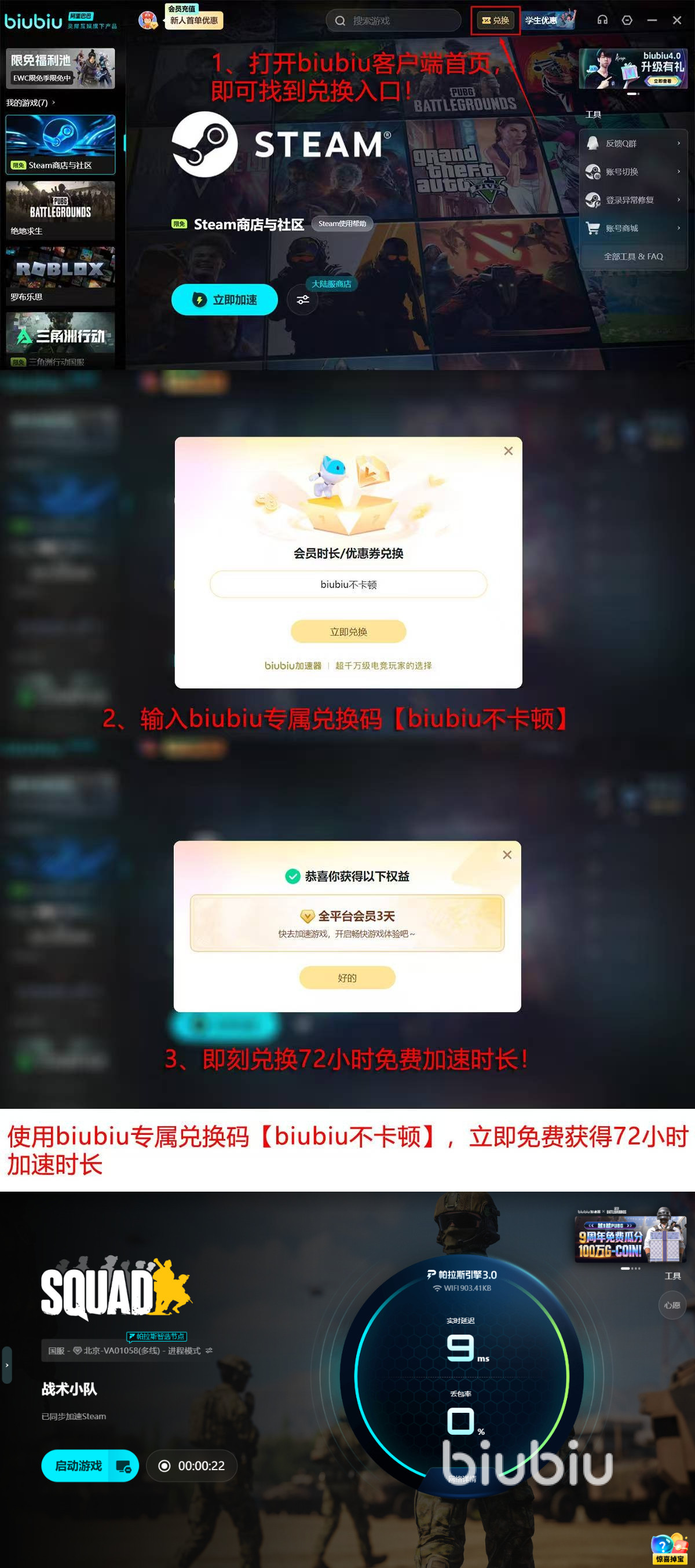即刻开启稳定体验:新用户注册即可获赠24小时全功能加速权限;输入激活码【biubiu不卡顿】,额外领取72小时加速时长,累计享有96小时免费服务。