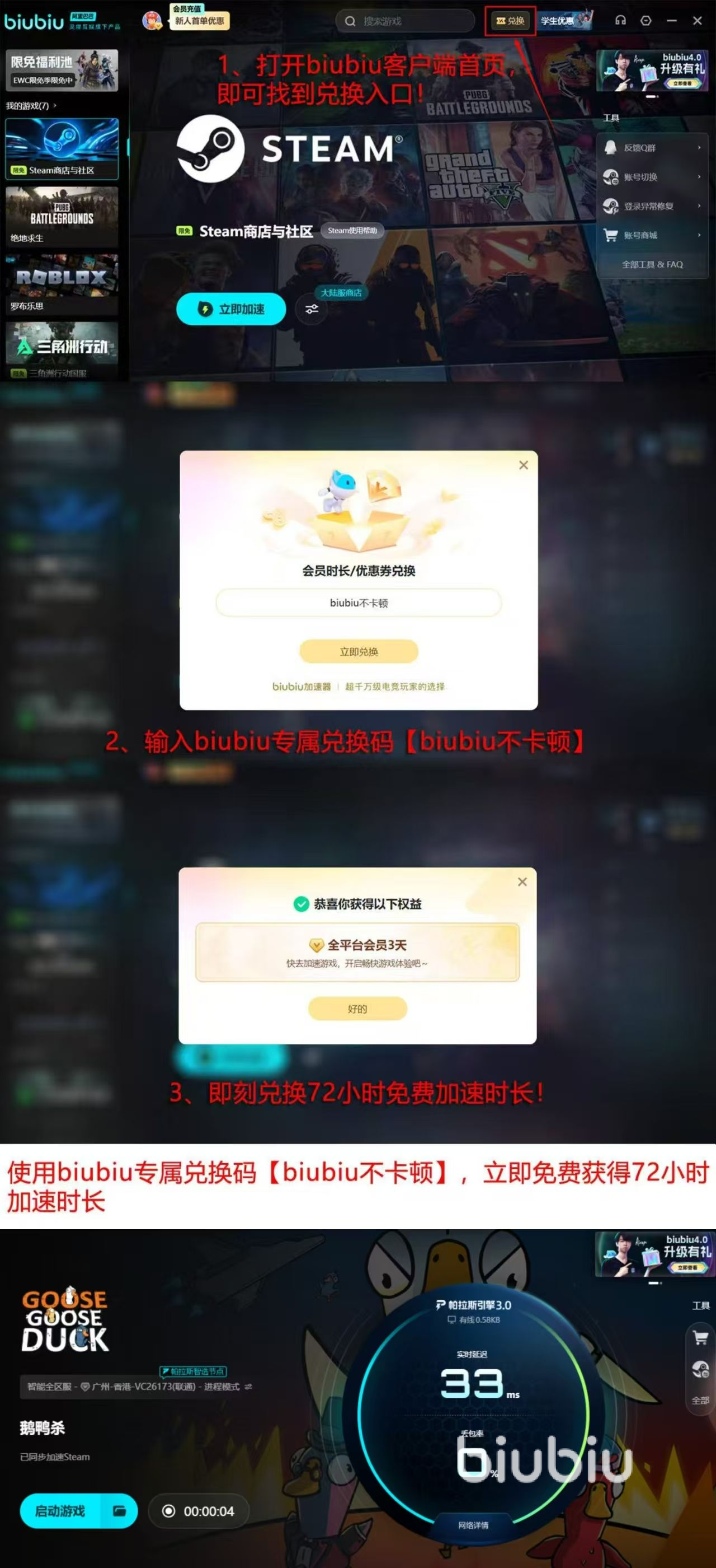 新用户注册biubiu加速器账户后,自动享有24小时全功能免费试用权限。完成新手引导后,输入专属兑换码【biubiu不卡顿】,还可额外领取72小时加速时长,累计达96小时无门槛体验期。该设计旨在帮助玩家充分验证加速效果,覆盖不同网络环境(如校园网、家庭Wi-Fi、移动热点)及多时段对局场景,全面评估其在《鹅鸭杀》中的实际性能表现。
