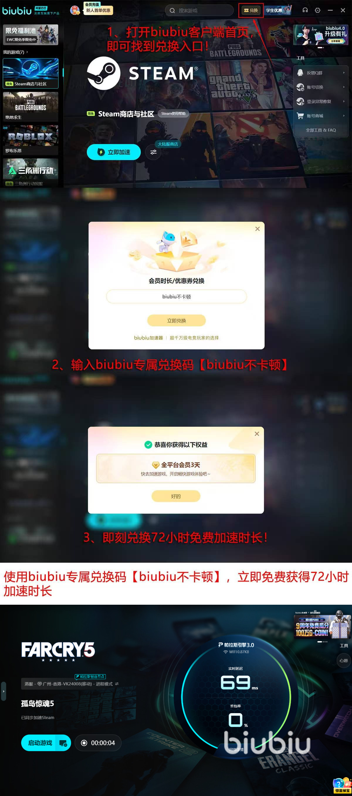 新用户注册biubiu加速器即可获得24小时全功能免费试用权限;输入兑换码【biubiu不卡顿】,额外激活72小时加速时长,累计96小时覆盖完整主线+全部DLC内容通关周期。若仍存在异常退出情况,建议联系官方技术支持团队,获取包含防火墙策略分析、端口占用检测、驱动兼容性诊断在内的定制化报告。