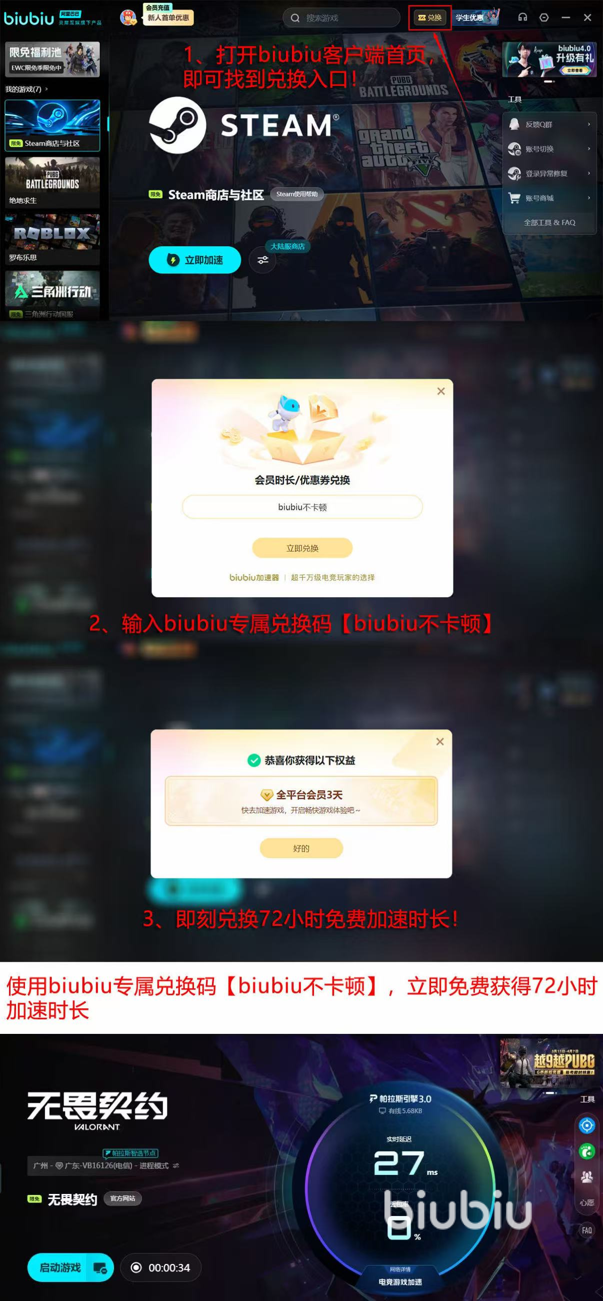 目前《无畏契约》已接入biubiu限免加速计划。新用户注册即可获赠24小时全功能免费加速权益,覆盖全部国际服节点;所有用户(含存量账户)输入口令码【biubiu不卡顿】,均可即时兑换3天无限制加速服务。全程无需付费,即可享受电竞级网络稳定性——对局加载速度提升、技能施放响应零延迟、团战语音清晰无断续,显著改善竞技体验连贯性。