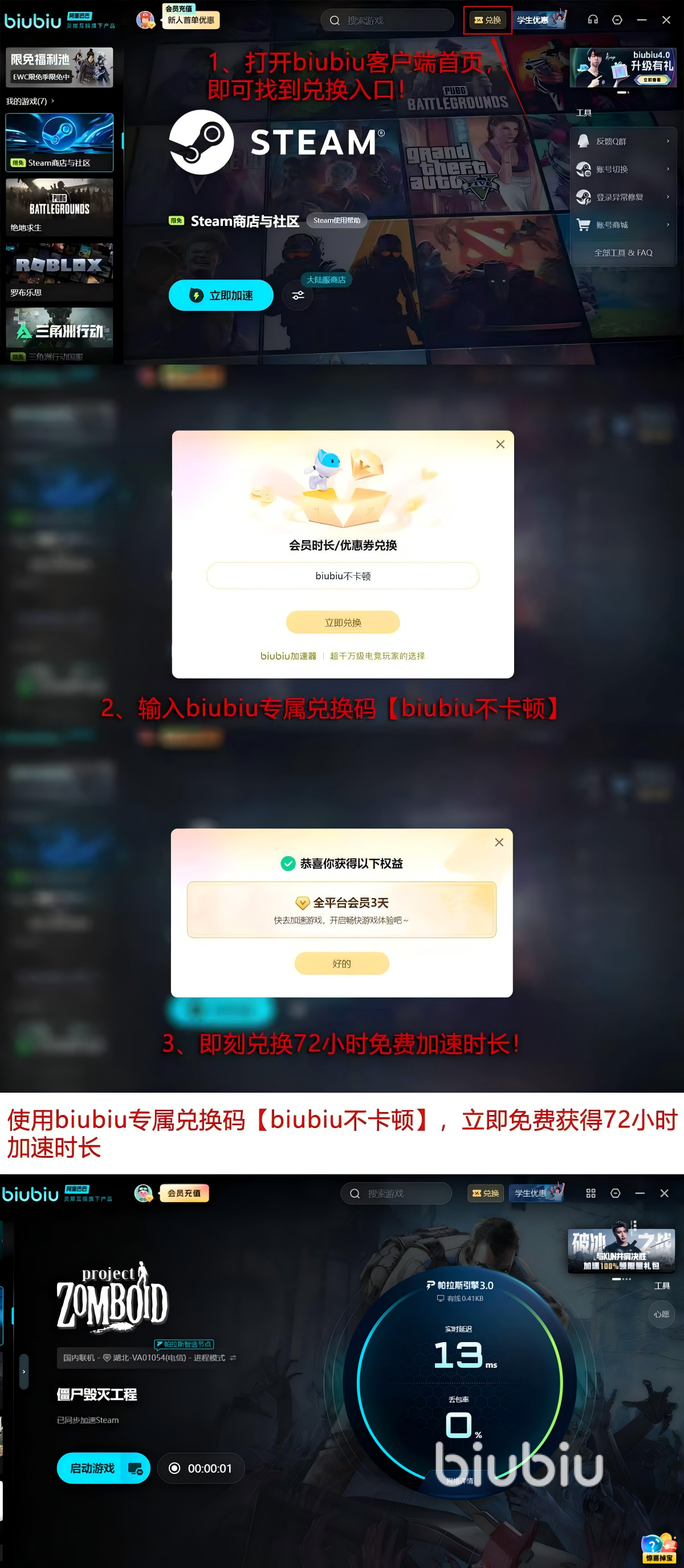 目前biubiu加速器正开展限时福利活动:新用户完成注册即可领取专属大礼包,包含24小时全功能免费使用权;登录后前往首页兑换栏,输入激活码【biubiu不卡顿】,无论新老账户均可额外获得72小时服务时长,累计可达96小时连续使用权益。