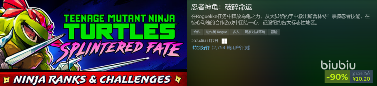 经典漫改游戏,经过强化的乌龟,不仅力量强大,还学会了各种武功。此次我们花费10.2元就能购入完整内容,准备出发,挑战大脚帮,从它们的手中救出斯普林特吧。