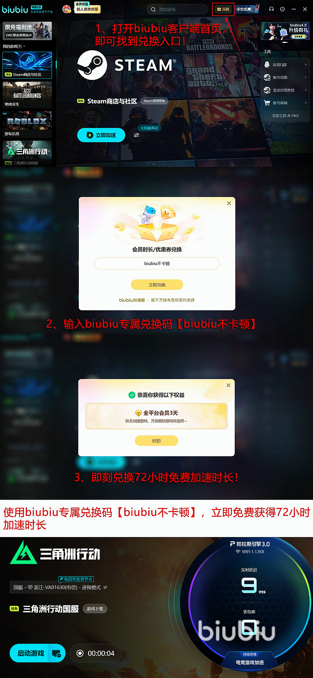 新用户完成注册后,可立即免费开启24小时全游戏不限速加速,全体用户在兑换中心输入专属口令【biubiu不卡顿】,即可额外领取3天免费加速时长,其中新用户更可以累计叠加两项福利获得96小时的加速哦。