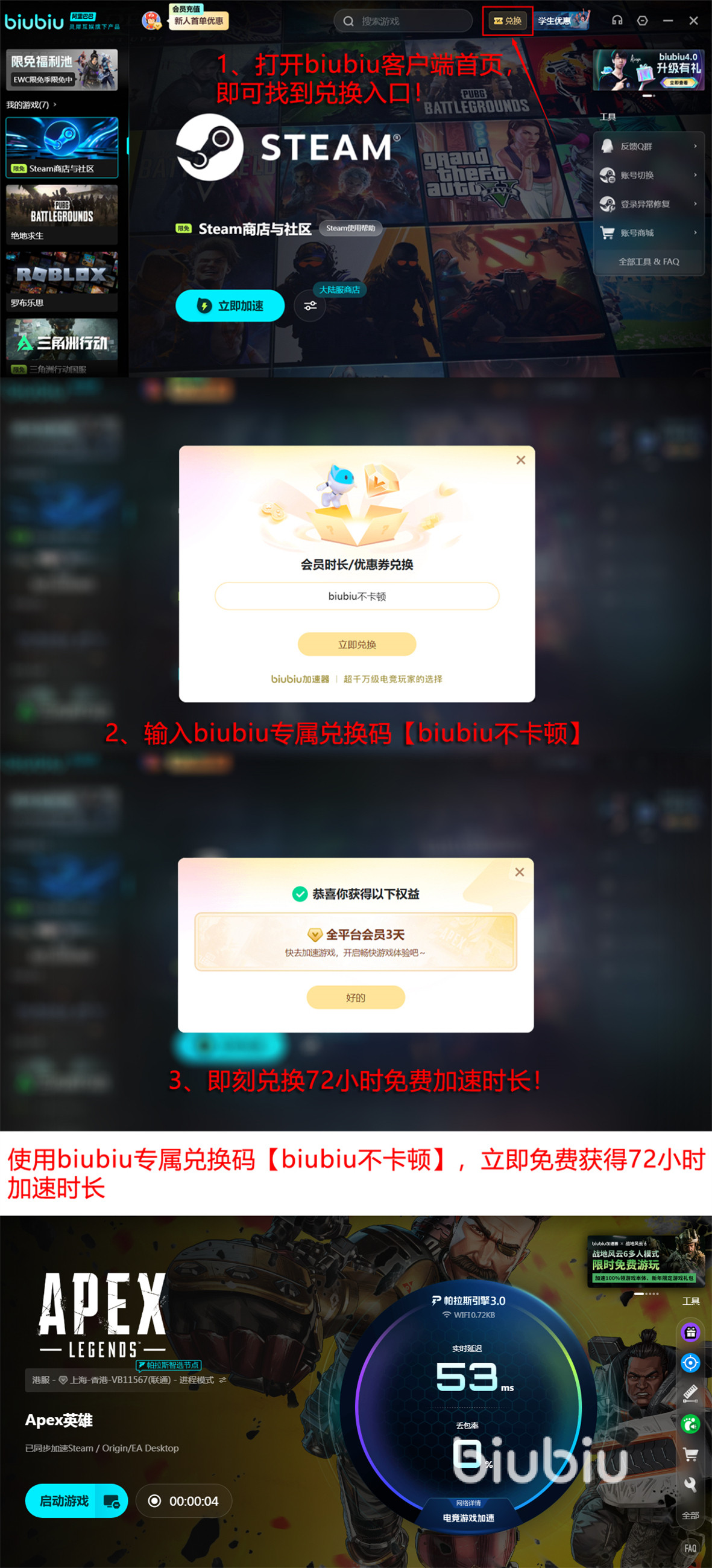biubiu的福利现在主要包括两大方面,第一项是新人才能享受到的免费加速24小时,注册完账号后就能直接打开使用。第二项是每个号都能用一次的兑换码【biubiu不卡顿】,能够兑换12小时加速时间。这样新人总计一共有96小时,完全可以在掌握了biubiu的真实性能之后再决定是否要长期使用,这也展现出了biubiu对自身功能的自信。