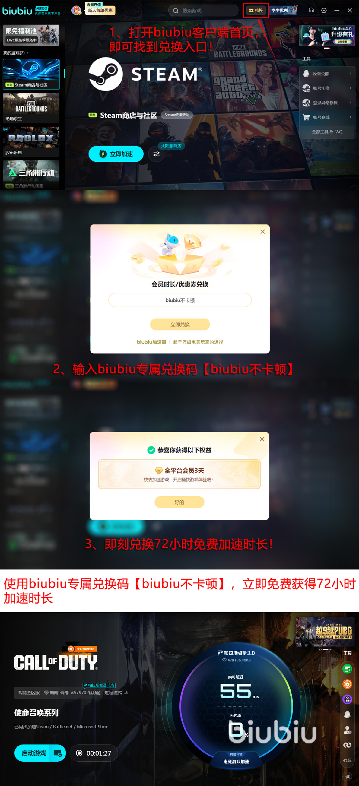 如果现在就想尝试一下biubiu的真实性能,只需要注册一个新号。利用好新号注册免费加速24小时的福利就能打开使用了。每一个号都有一次用兑换码【biubiu不卡顿】兑换72小时加速时间的机会。这就相当于新人一共有96小时的免费时长,完全可以先试用然后再决定是否成为会员。后续会员价格也很优惠,平均每天不到1元钱,长期使用下去也没有任何的负担。