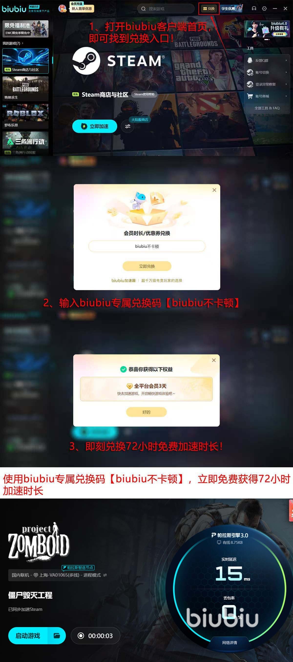 对于正在玩僵尸毁灭工程的玩家,长期受到网络困扰的玩家,都可以使用biubiu加速器来改善网络,而且,现在是可以领取2个免费时间段先体验一下,一个是注册新账号就能拿到的24小时福利,另外一个是在首页“兑换”功能处,手动输入【biubiu不卡顿】口令,就能都得到72小时,总时间有96小时,满满4天体验时间。