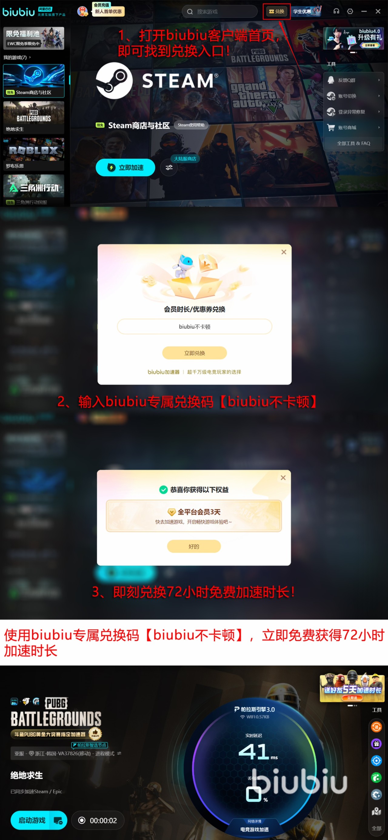 在biubiu上还有很多的福利内容,比如说新人用户在登录加速器后能直接获得24h的免费加速,新老用户都可以用【biubiu不卡顿】来领取到3天时间的加速。