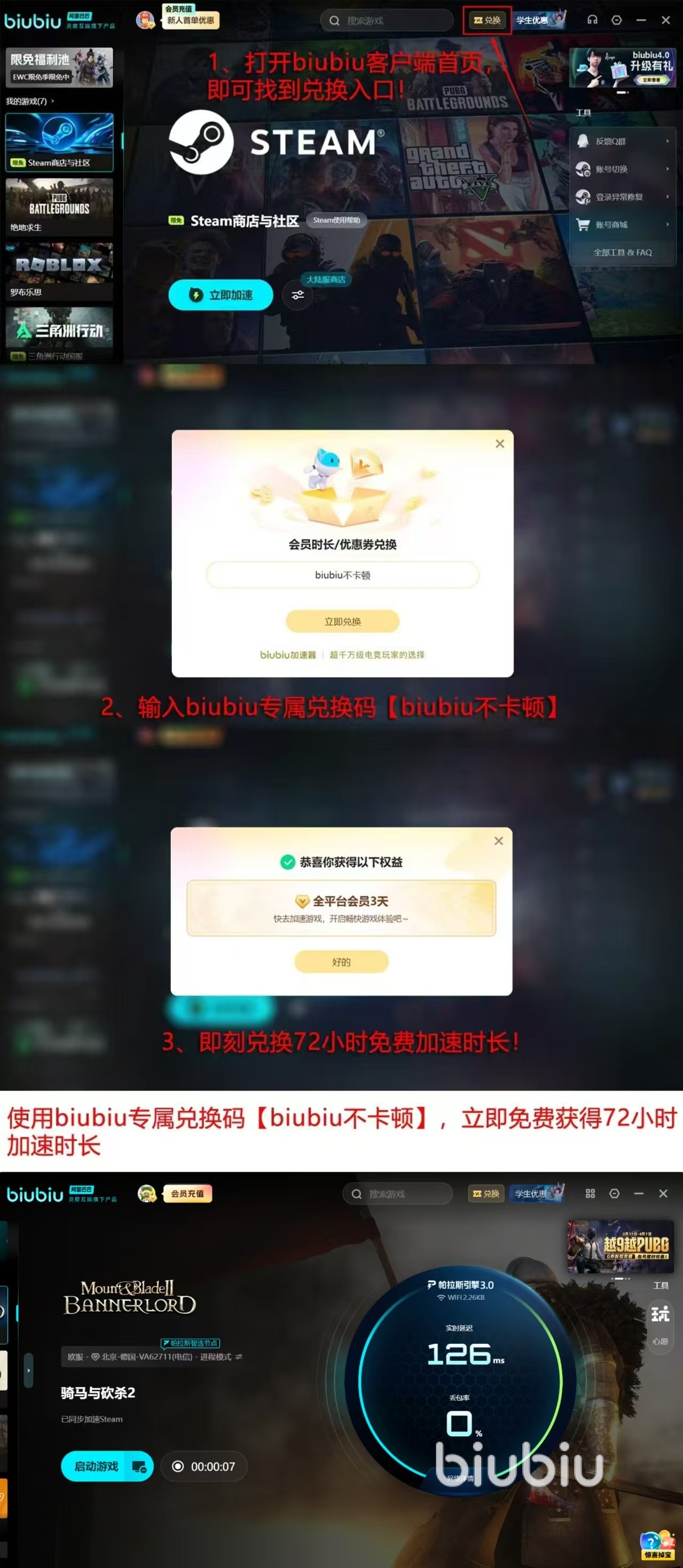 在说完biubiu加速器以上的优点后,相信有人已经心动了,惊喜还在后面。现在为了惠顾新老用户推出重磅福利,新用户首次注册24小时是可以免费加速的,新老用户输入兑换码【biubiu不卡顿】还能再享72小时免费的加速服务。对新用户意味着96小时无闪退的情况下尽情畅玩。