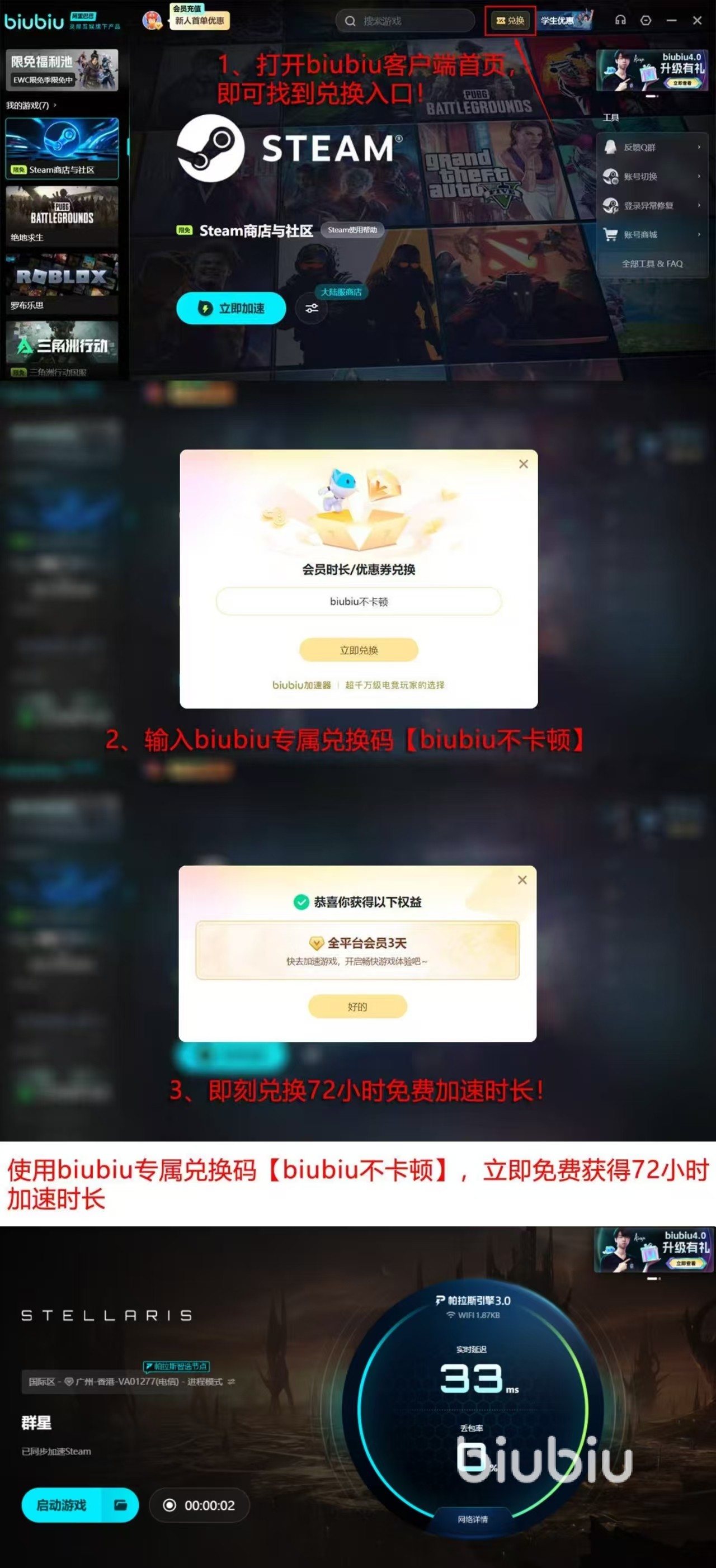 除此之外,biubiu加速器给用户也带来了很多方便的服务。注册biubiu加速器账号后可以得到24小时免费试用期。而且输入兑换码【biubiu不卡顿】后可以再获72小时的免费加速时间,一共是96小时的加速体验,可以对游戏进行全方位的测试。无论是在建造舰队、开拓星域还是开展重要战役的时候,这段时间都会给你带来网络延迟得到改善之后的顺畅操作体验,并且会降低因为闪退而产生的挫败感。