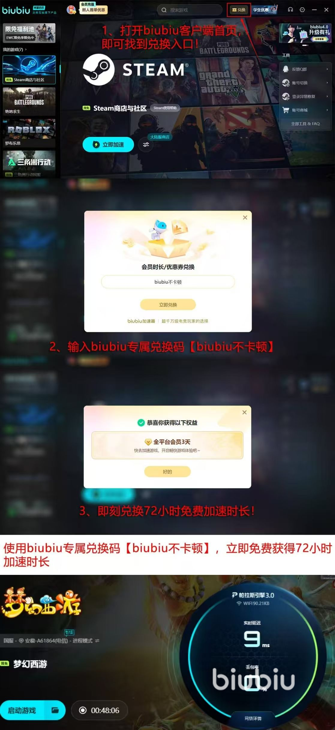 注册biubiu加速器账号之后就可以得到24小时的免费试用期,体验全功能加速服务。使用过程中输入兑换码【biubiu不卡顿】,所有的用户都可以免费享72小时网络加速期,该种策略既可以给玩家足够的时间去测试,又可以体会游戏流畅度明显提高的感觉,从而摆脱掉线的困扰,把全部精力放在游戏中。