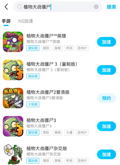 第一步打开biubiu,第二步在首页搜索栏输入游戏名进行搜索,结果跳出之后我们会发现不同版本的加速方式biubiu这里都提供,足以证明它的服务范围有多广,就选择自己需要的即可。第三步就是点击加速,立马进入服务状态,然后就能开启游戏程序。