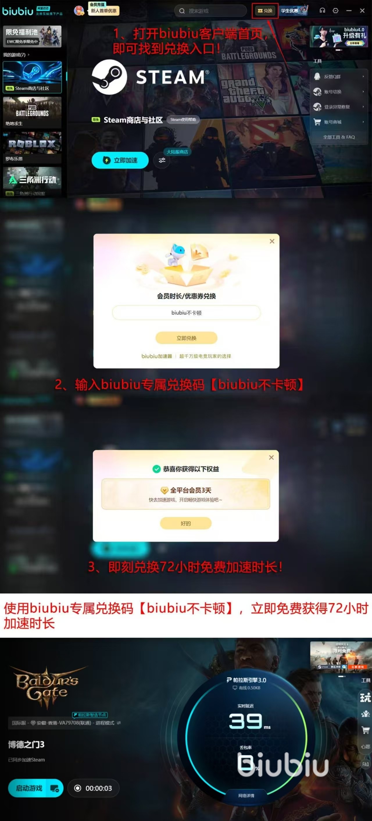 注册biubiu加速器账号之后就可以获得24小时的试用期,可以立刻感受到加速的效果。新老用户输入兑换码【biubiu不卡顿】,可以得到72小时的免费加速时间。这就意味着新用户可以获得96小时的高速、稳定的网络服务,不管是连续几天的游戏体验,还是在不同的网络环境下进行测试,时间都是充足的,让每一个玩家都能感受到加速带来的飞跃式提高。