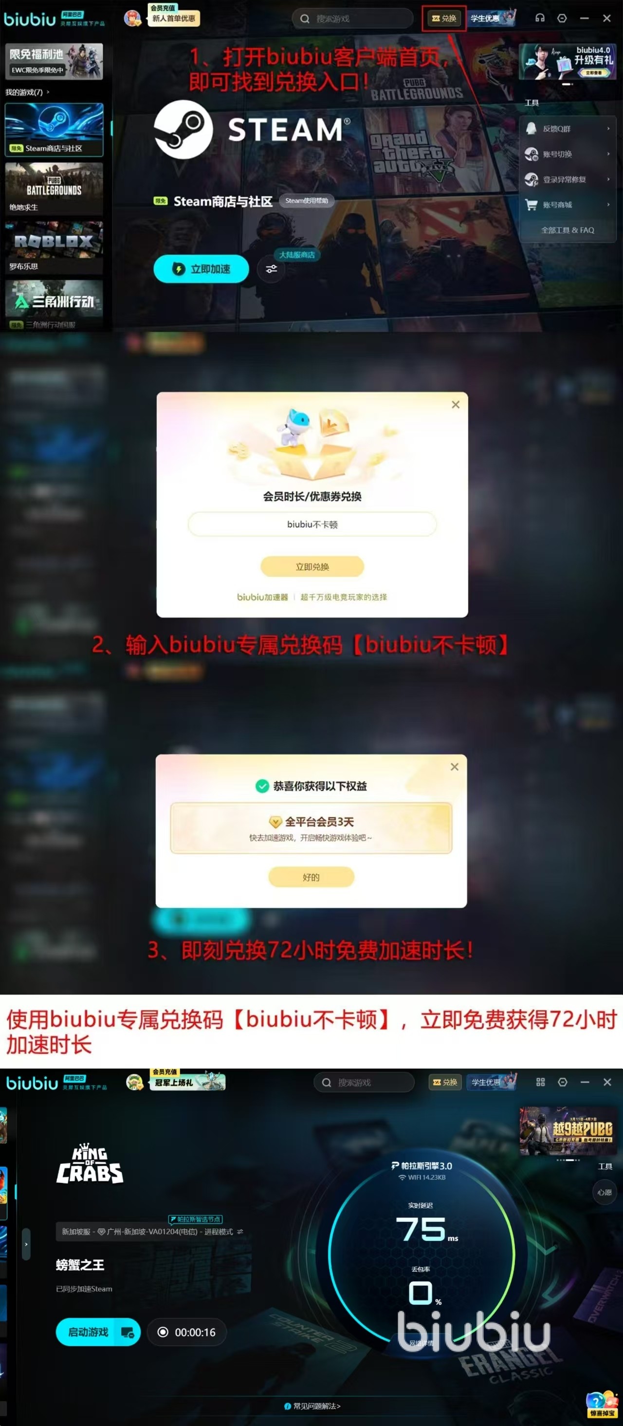 如今biubiu平台有很多福利给到大家,如果是第一次注册,可以24小时享受免费加速,体验高质量网络环境下无忧畅玩的痛快,输入兑换码【biubiu不卡顿】再送72小时,加起来就是96小时0投入不受网络卡顿干扰尽情地肝,当然老用户也可享受输兑换码送免费加速的福利。现在充值可根据自己的情况选择双年卡、年卡、季卡等的优惠套餐,大学生认证身份也有专属福利。