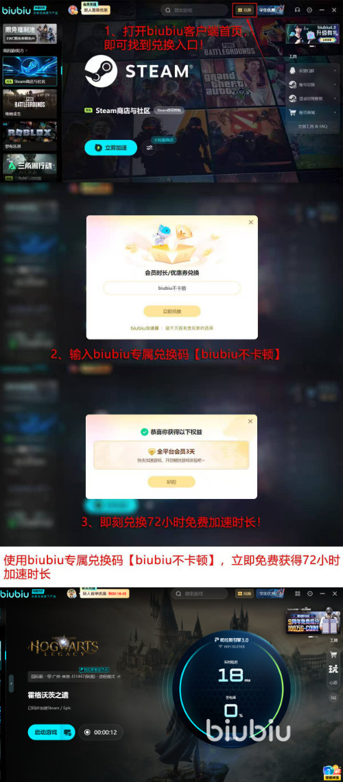 不仅加速实力出众,biubiu加速器还为新老玩家准备了诚意满满的福利。对于首次注册的新用户,完成账号注册后,系统将自动发放24小时免费加速时长。同时, 输入专属兑换码【biubiu不卡顿】,即可额外获得3天(72小时)免费加速时长,新用户叠加两项福利后,总计可享受96小时无限制加速服务。兑换流程简单便捷,手机端、PC端通用,全程不超过30秒,小白玩家也能轻松操作。
