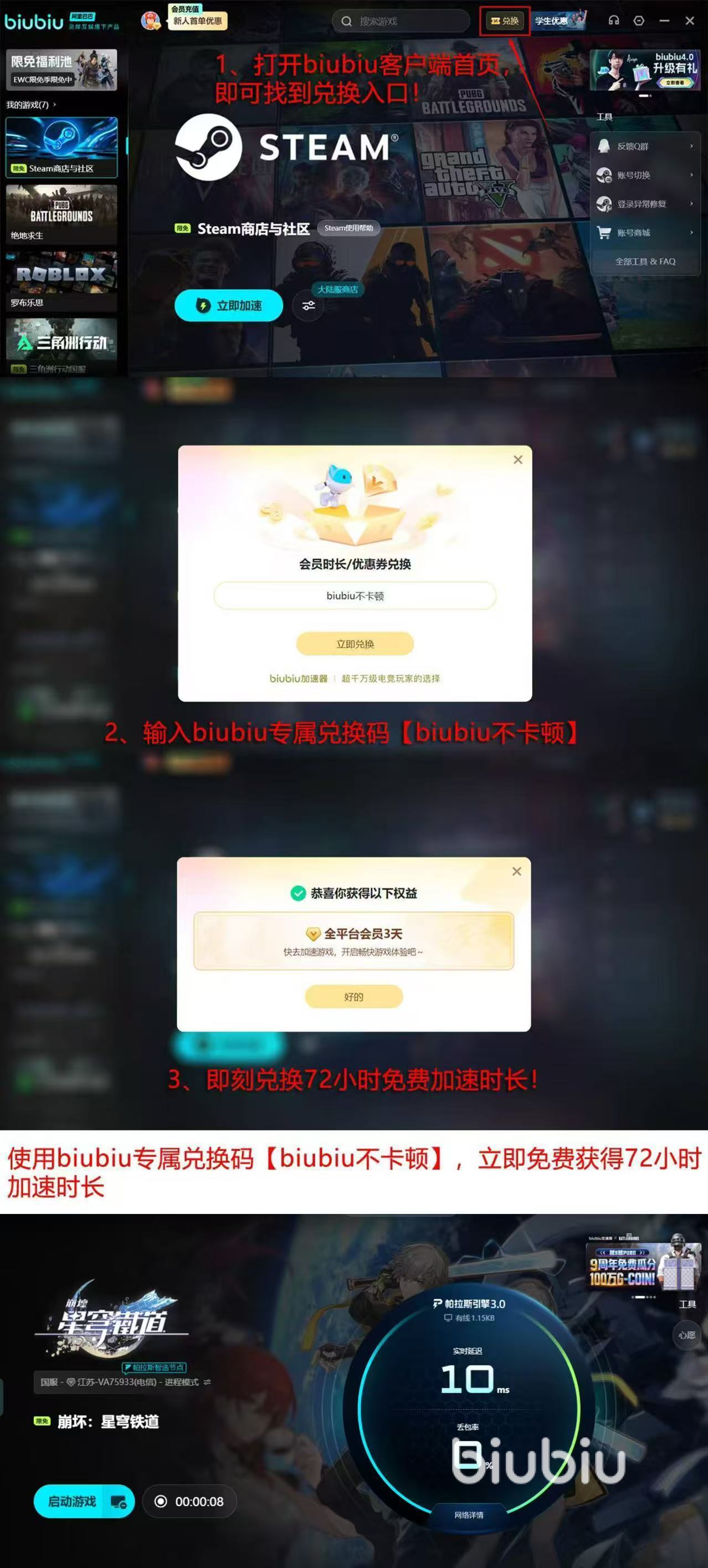 此外,为回馈所有用户的信任,新用户注册免费加速24小时,无论新老用户,只需在客户端或官网兑换处输入【biubiu不卡顿】,即可额外再获得 3 天(72 小时)免费加速时长。进去biubiu加速器领取超多的游戏福利