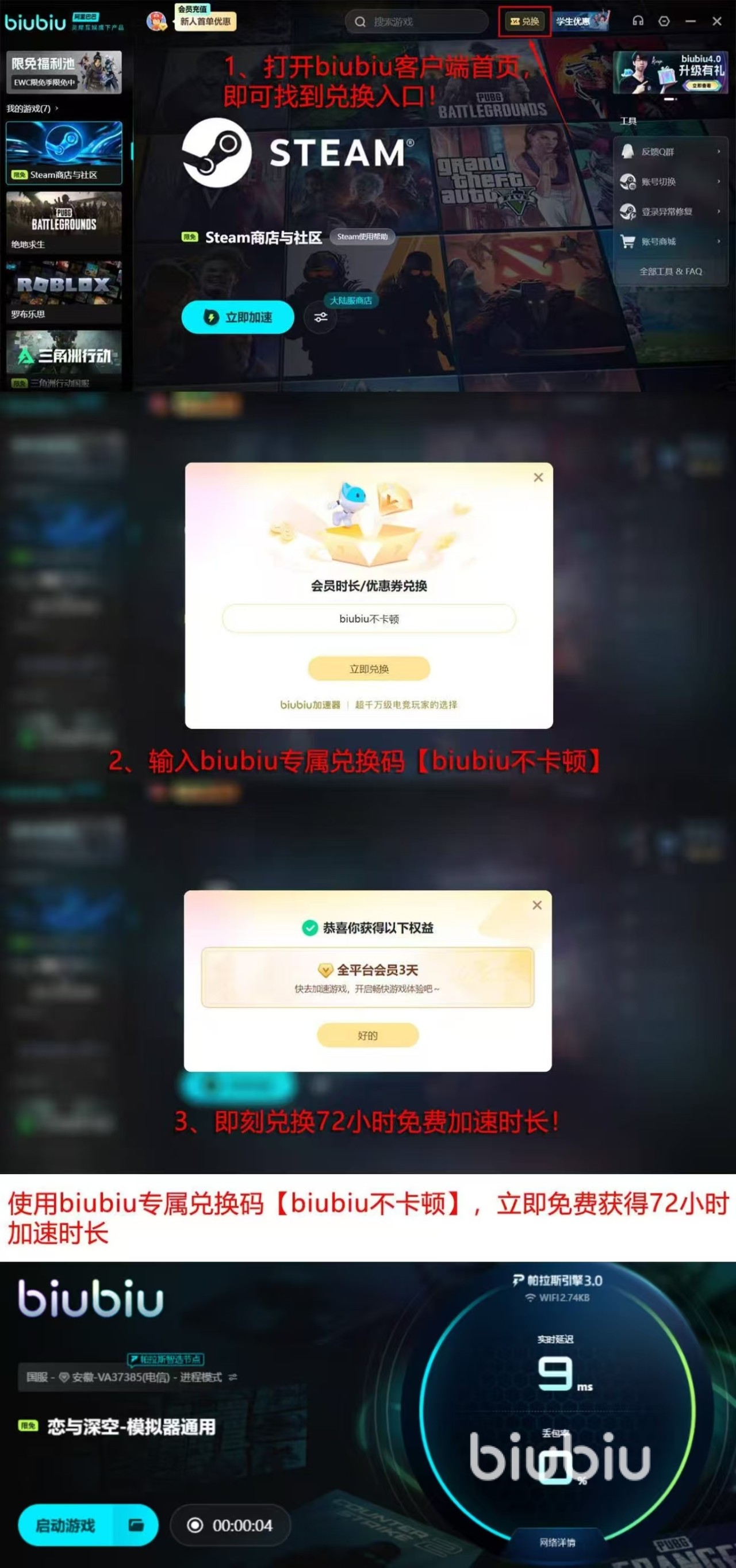为了使玩家尽快感受到提升,biubiu加速器也提供了十分吸引人的用户优惠。注册biubiu加速器账号后可以得到24小时免费试用期。而且输入兑换码【biubiu不卡顿】之后可以额外获得72小时的免费加速时长,保证你有足够的时间去感受游戏流畅升级带来的好处,彻底摆脱闪退的困扰。不论是剧情模式还是多人互动玩法,在一定程度上可以更加自由地去探索游戏的世界,不会因为突然中断而被打断。