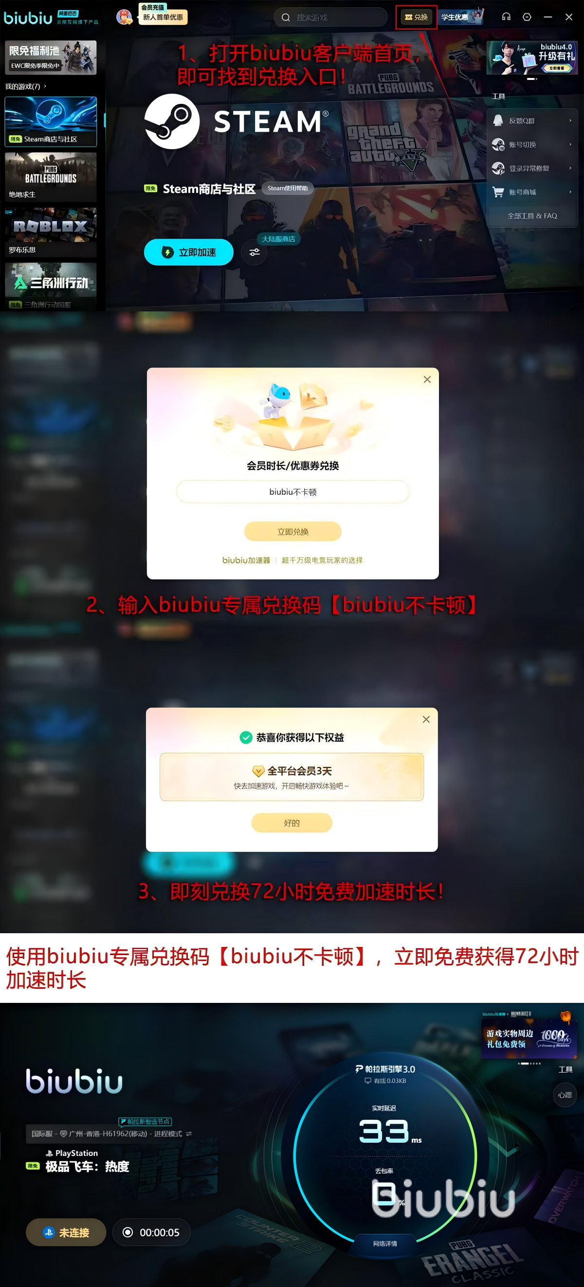 考虑到很多人是刚认识biubiu,了解还不深,所以biu仔直接就准备了大礼。新人加紧完成注册,就能得到大礼包,马上开始快乐的24小时免费加速之旅,然后兑换活动也是特别棒的,获悉【biubiu不卡顿】这个口令码之后,直接在首页换,多拿72小时加速服务时间,这样新用户就能累积到96小时免费服务时长用了。