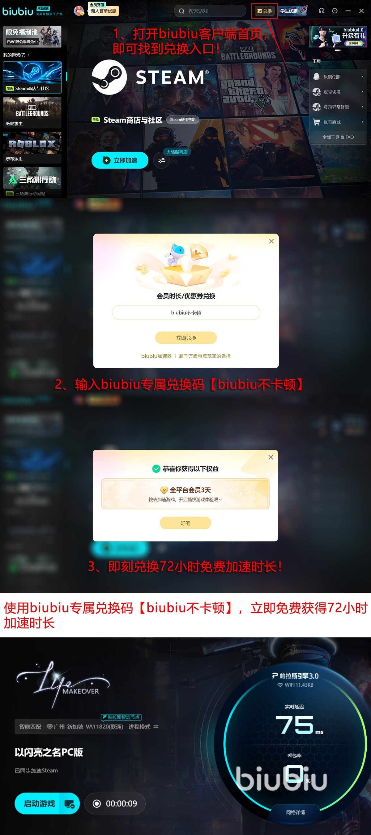对biubiu熟悉的用户别担心,它对新注册的用户赠送了24小时免费使用加速的福利。其次,新老用户只要输入兑换码【biubiu不卡顿】,都可免费享受三天使用加速的福利。