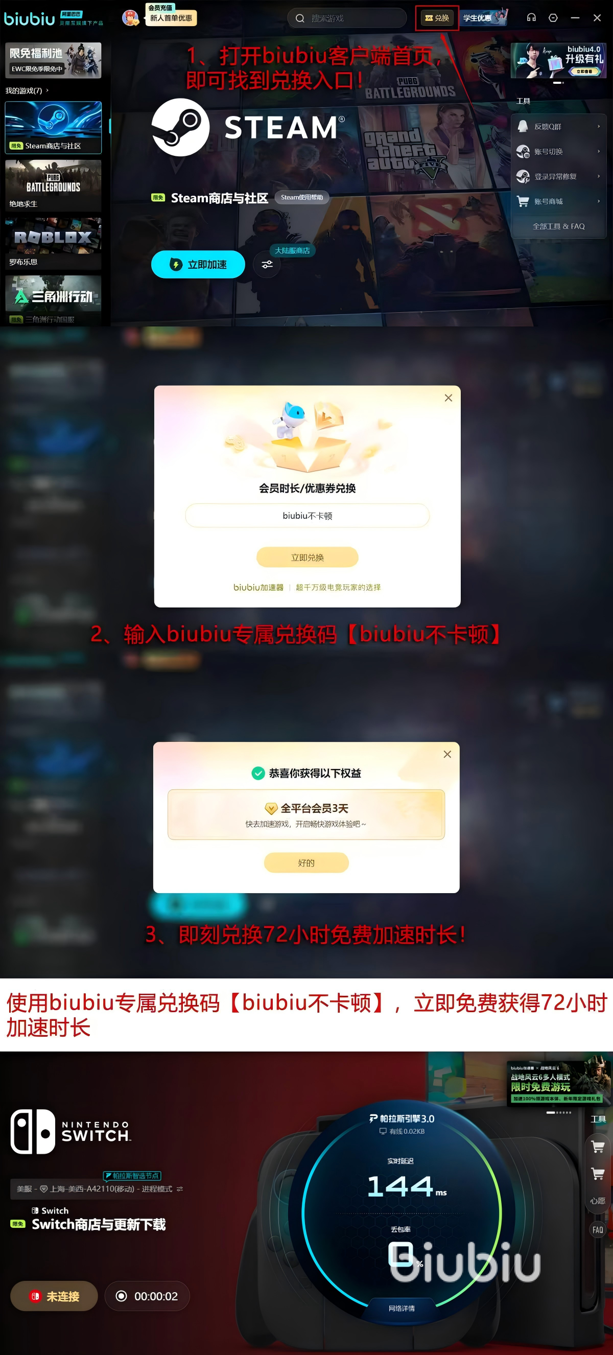 试用优惠多多,来领就有。新账号注册好之后,马上送来的是免费的24h加速时间。其次兑换活动已经准备好了,在首页这里有入口,按照下图流程输入【biubiu不卡顿】后,立刻又能领取到免费的72小时服务时间的。新用户一般建议一口气领完,这样是一下子有96小时的免费加速时间能用,为后面的正常游戏过程保驾护航。
