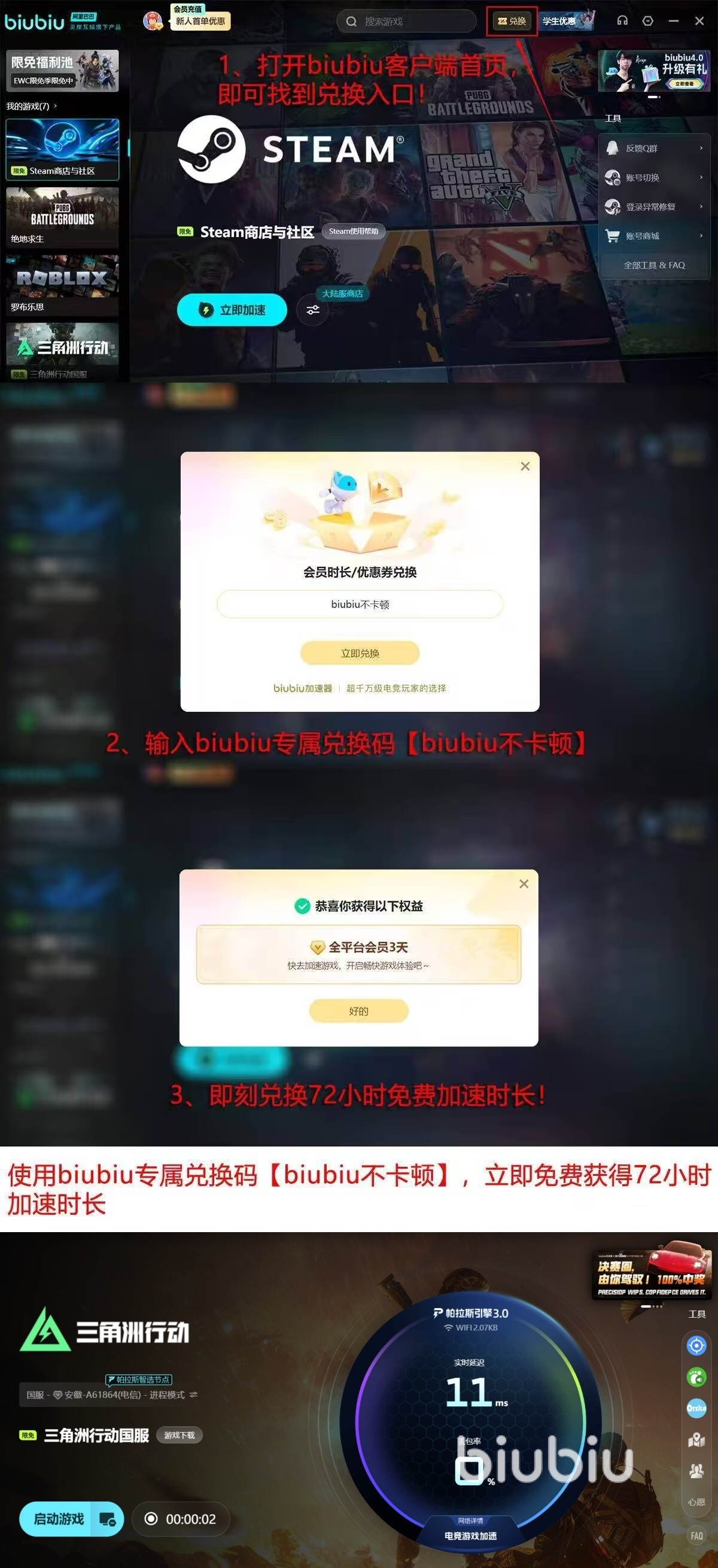 零门槛体验顶尖加速服务也是biubiu加速器为大家准备的惊喜,现在新用户注册账号就可以在登录之后,得到24小时全平台免费体验权限,足以应对一次完整游戏紧急的网络调试,如果希望能拥有够充裕的体验时间,那么打开兑换界面输入【biubiu不卡顿】,便能额外的得到三天的继续免费加速权限,权益面向平台所有用户开放,无需绑定任何支付方式及大降低玩家的失措成本。