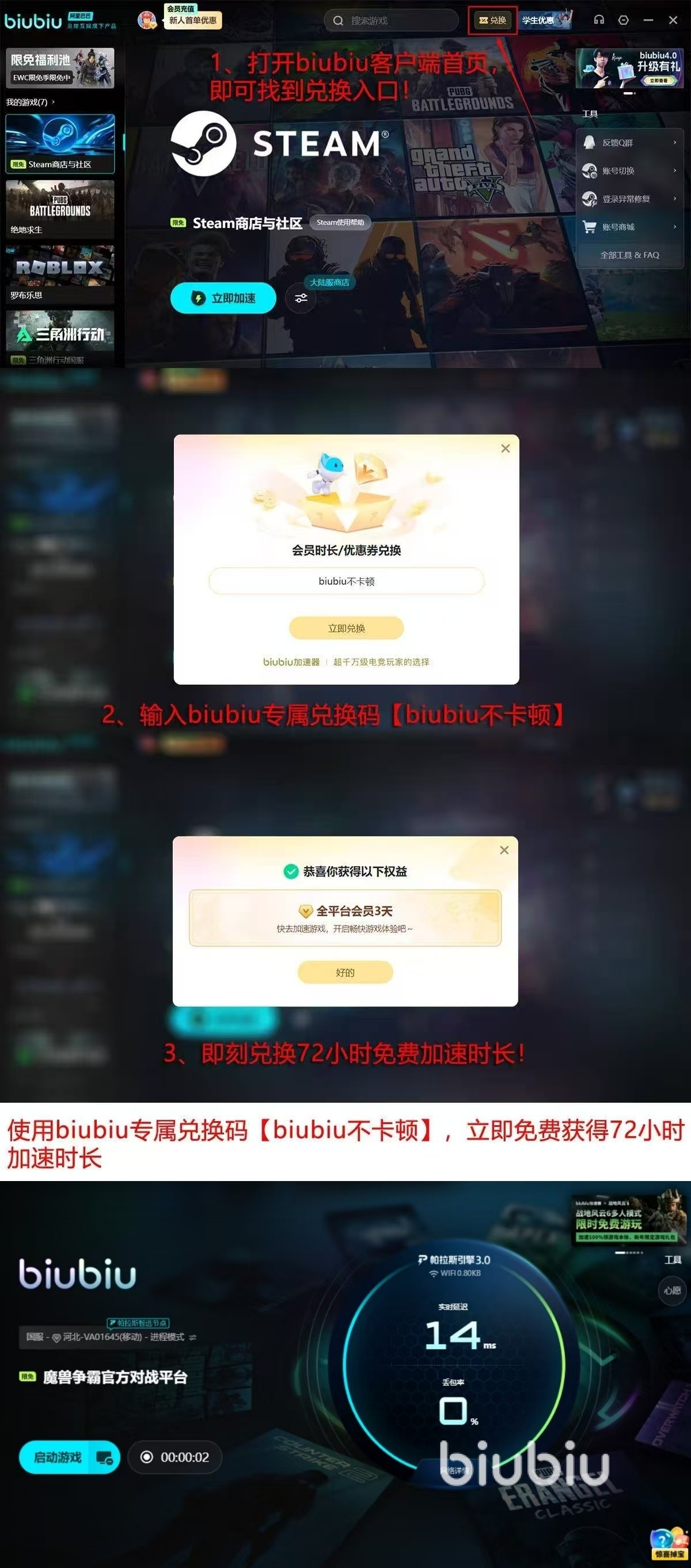 为了让更多的魔兽争霸玩家体会到专业加速的魅力,biubiu加速器给新用户准备了诚意满满的入门福利,注册之后就能激活首日24小时全部功能使用权限,输入【biubiu不卡顿】,就可以立即生效72小时,这样的新人可以享受96小时,可以免费试用电竞级专线加速,智能节点切换,防断连保护等所有核心功能,亲自体会游戏加速器给游戏带来的流畅感。