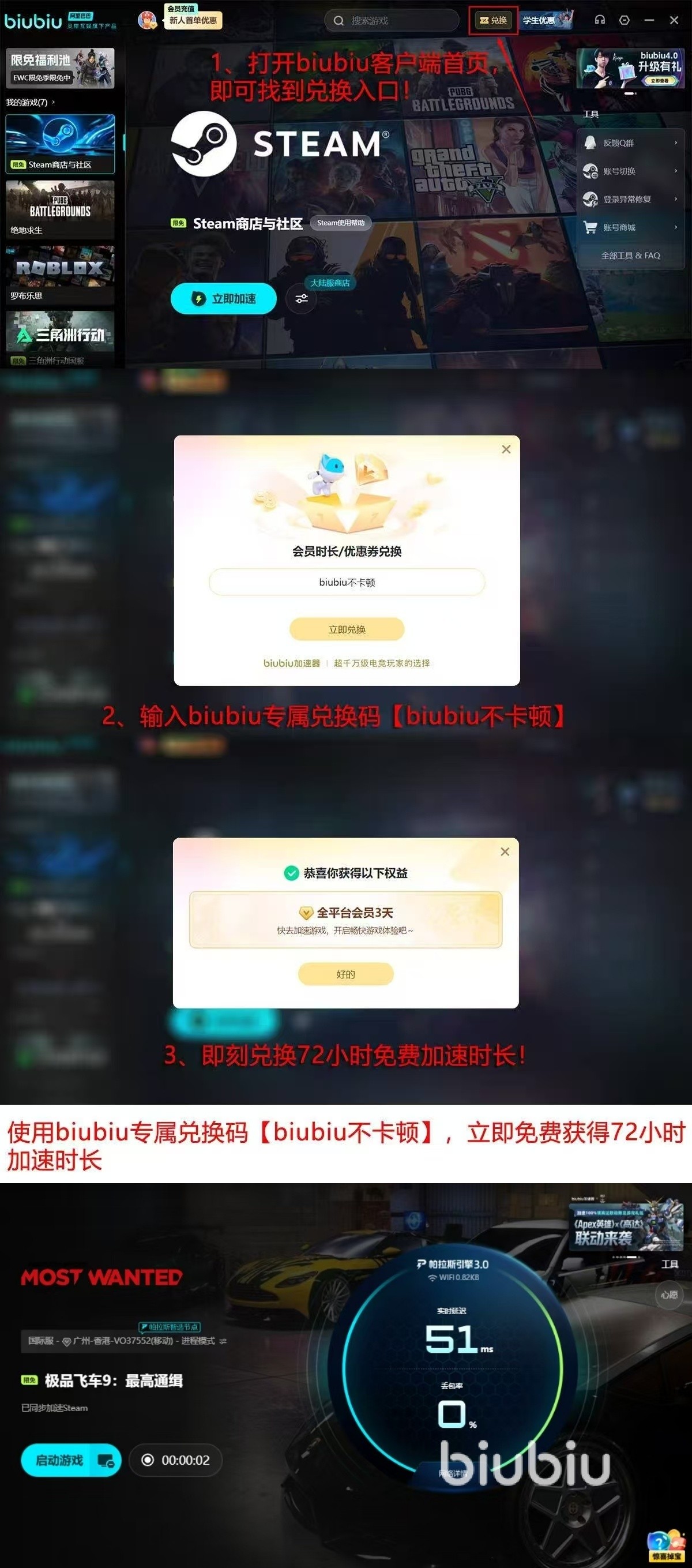 新用户注册biubiu加速器,就可使用专属通道领取多种优惠,马上享有24小时全部功能免费体验权,口令叠加,输入【biubiu不卡顿】,再得72小时加速时长叠加畅玩总共可以享受96小时的网络加速服务。