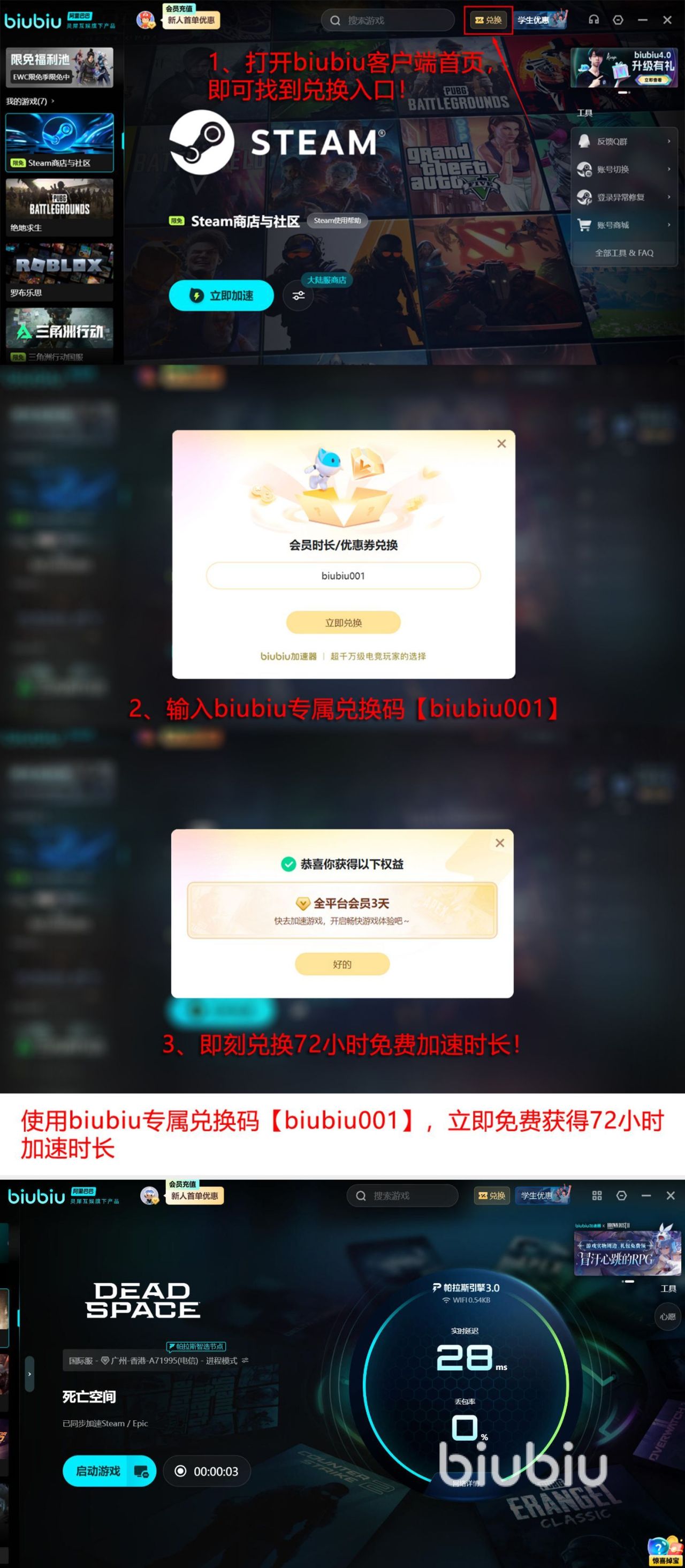 应用的兼容性相对来说比较广,已经包括了上万款不同的游戏类型,总是能够让大家选择到自己心仪的游戏,同时也会进行定期的更新。不过最引人注目的就是所携带的免费福利,当大家用账号成功,首次激活之后,就会立即拥有24小时的加速特权,其次,当使用完之后还可用【biubiu001】再获得三天的免费加速特权。那么两种方式都可以同时使用,对于首次体验的人群来说就有福了,因为可以共享受96小时的免费加速特权。经过长时间的使用之后,就了解到此应用的各种实力或者是操作的方式。