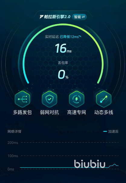 使用biubiu加速手游甚至是免费的,使用无门槛那肯定不能错过。白用的福利biubiu也没有糊弄大家,降低延迟的速率特别快,一两秒就进去状态了,数值能少个三分之一,开着炫酷赛车漂移起来手感很好,没有转向不灵敏的感觉,大伙就可尽用吧。