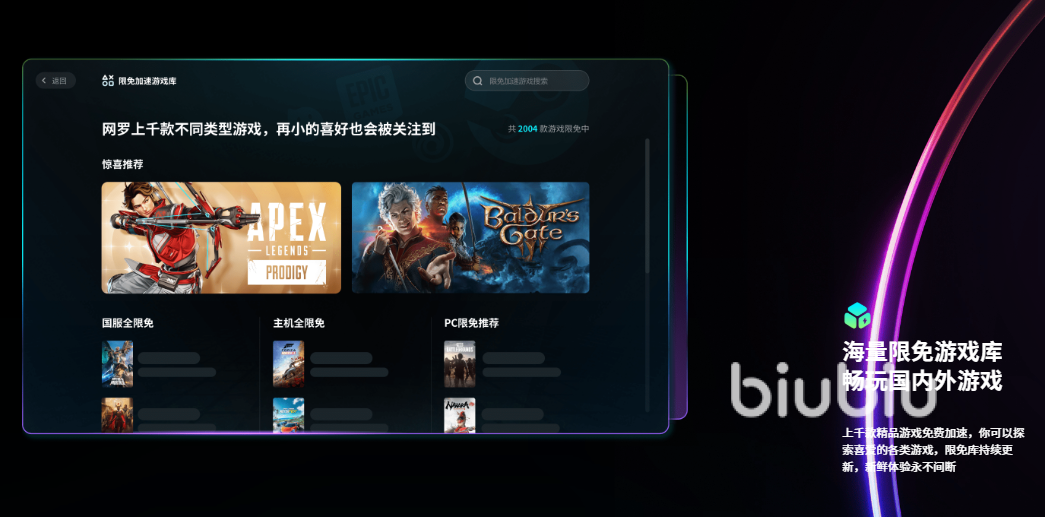 考虑到有很多用户不敢轻易尝试提速工具是因为大多都需要花钱,所以在这一方面biubiu是提供了不少福利的,比如平台有超多作品,都长期有着免费的提速福利,尤其是一些可以下载游戏的应用商店,其次就是一些新游上线时,平台也会有相关的限免活动,让小伙伴们有机会体验。