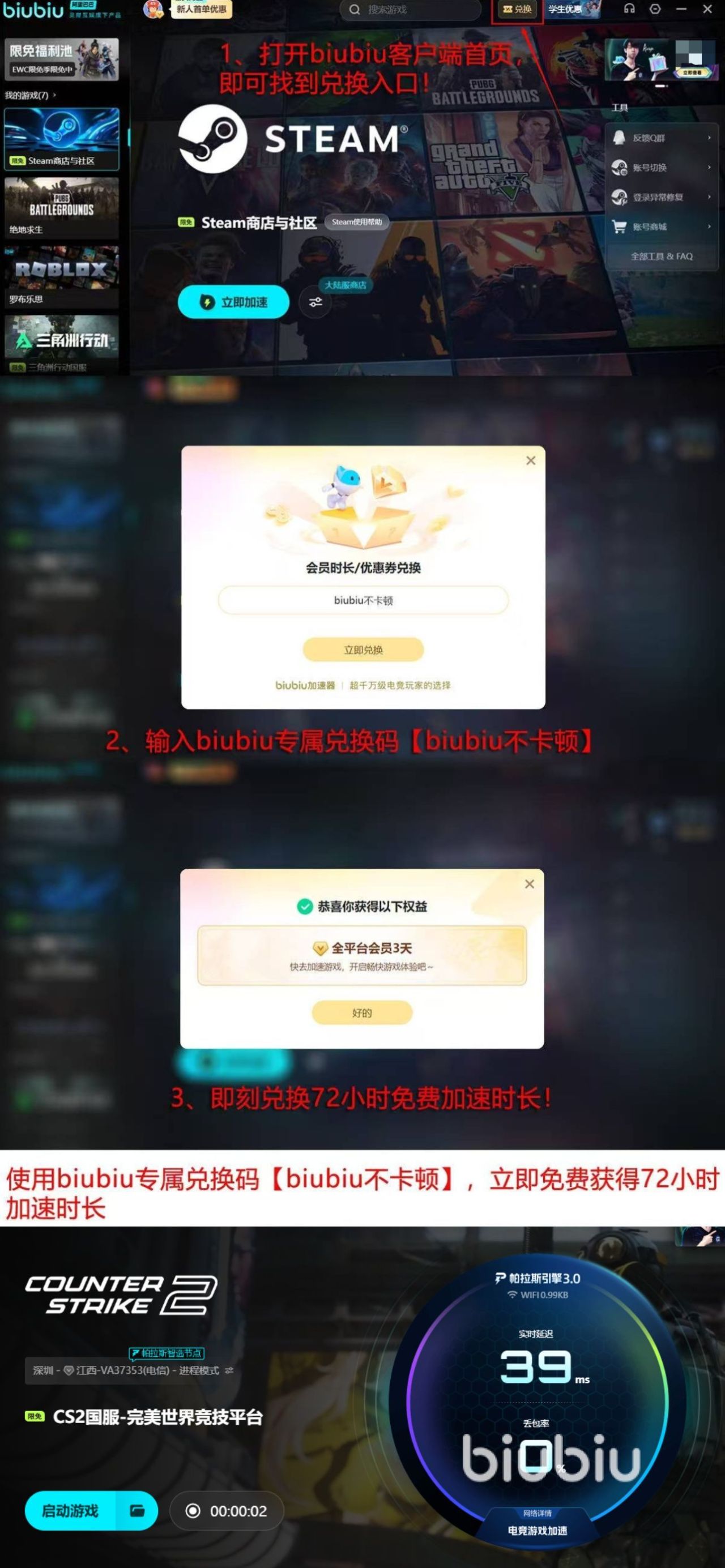 对于新用户,还准备了大力度的优惠政策,注册即可享受24小时全部功能体验,新老用户输入【biubiu不卡顿】,再加送72小时加速时间,新用户总共可以使用96小时免费加速服务,低成本解决软件闪退问题。