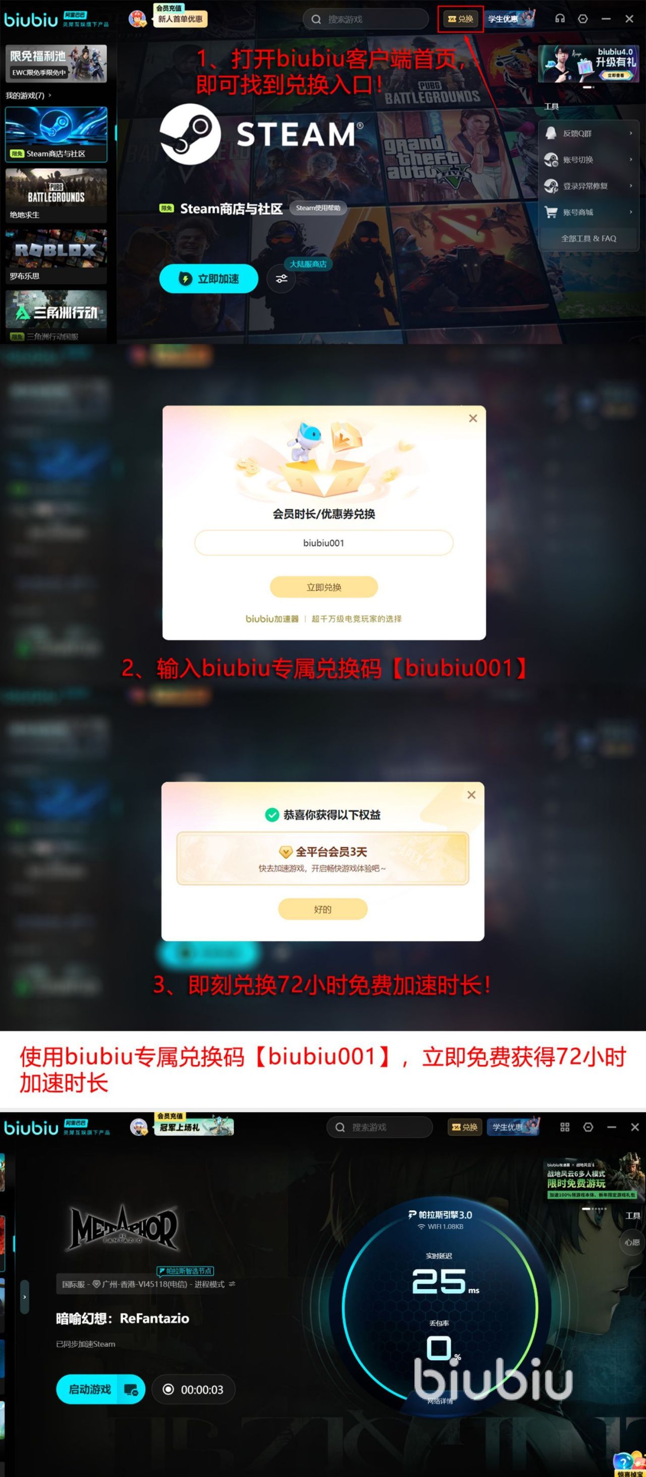 当前为所有新老用户都推送出免费试用机会,尤其是新用户能够叠加至长达4天的全平台加速时长,新用户完成注册之后即可获得24小时免费加速福利,新老玩家使用兑换码【biubiu001】能获得72小时加速时长,当免费加速时长结束之后,我们也可以选择限免专区中的游戏。