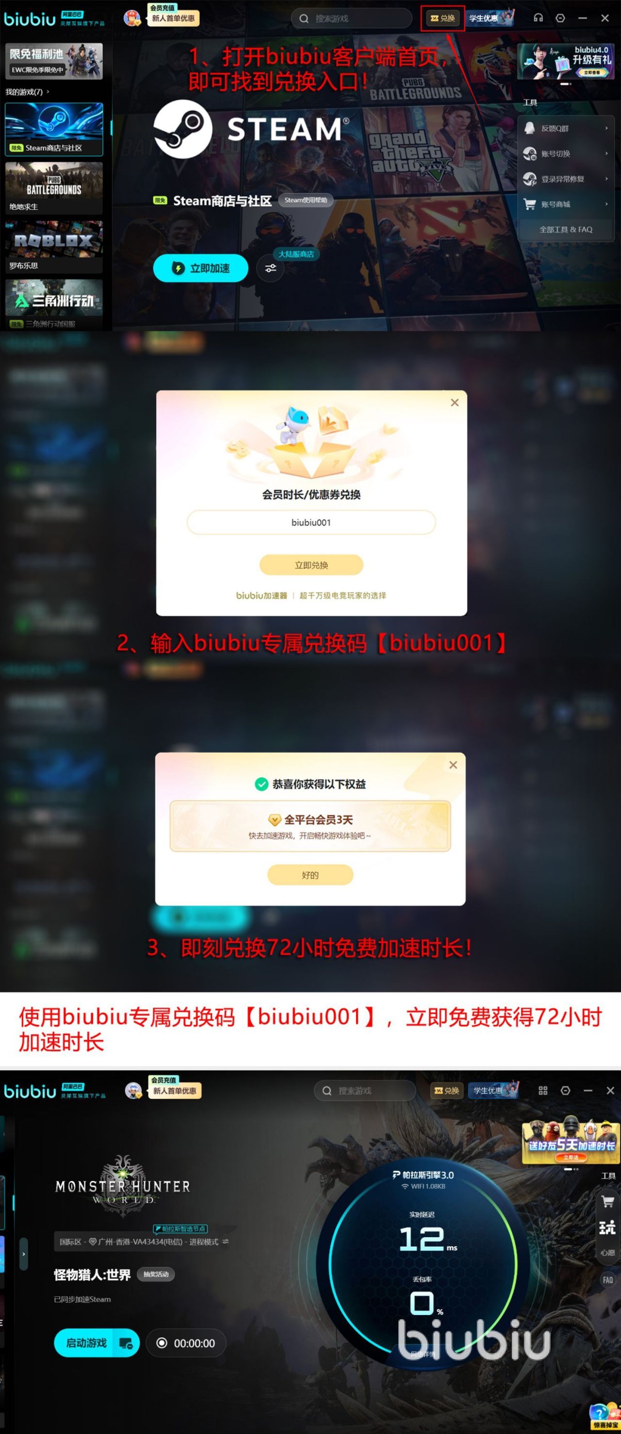 当前也推送出一系列福利,支持所有用户畅享,新用户点击链接下载,完成注册之后,即可获得24小时免费加速时长,【biubiu001】所有新老玩家也可参与兑换活动,只要将口令输入到兑换界面,就能够成功获得72小时免费加速福利,两种福利新用户叠加至96小时。