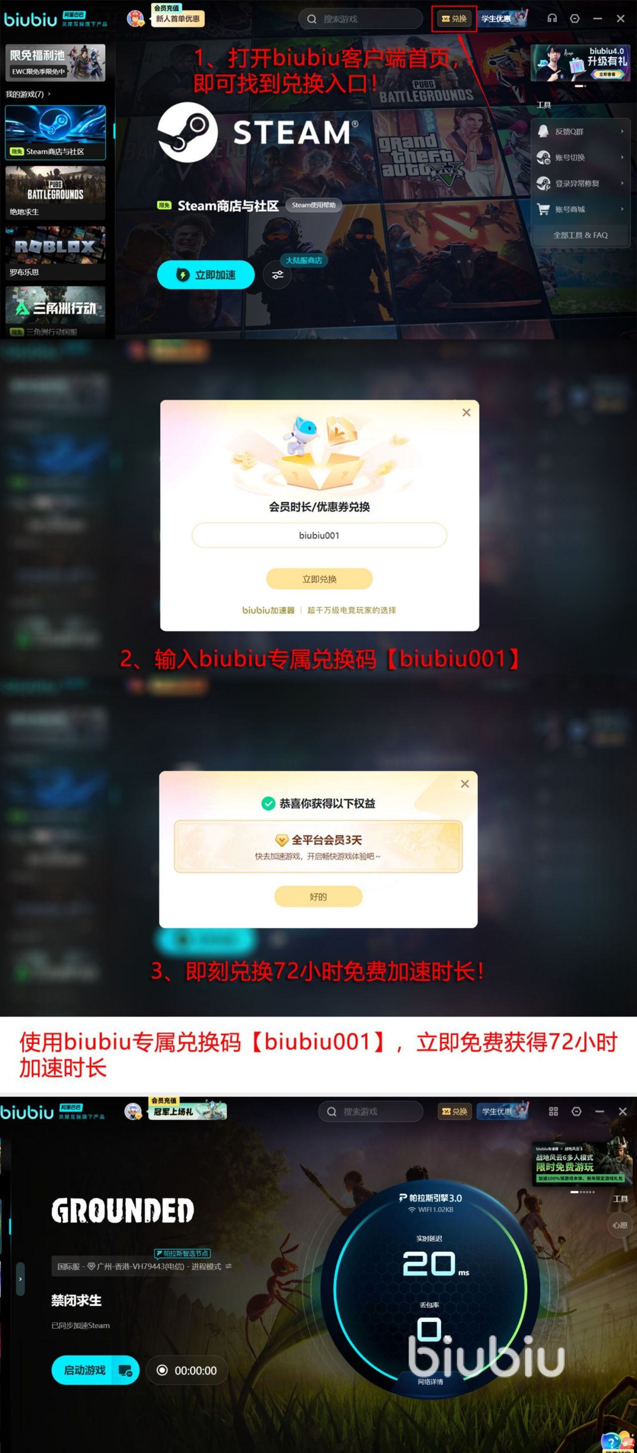新版本上线,不仅拥有足够优越的加速服务,同时还有众多福利活动等待你领取,新人注册完成实名认证,即可享受24小时加速福利,所有新老用户也可参与口令活动,只要使用兑换码【biubiu001】就能领取72小时免费加速时长,新人累计最高可获得96小时游戏体验时长。