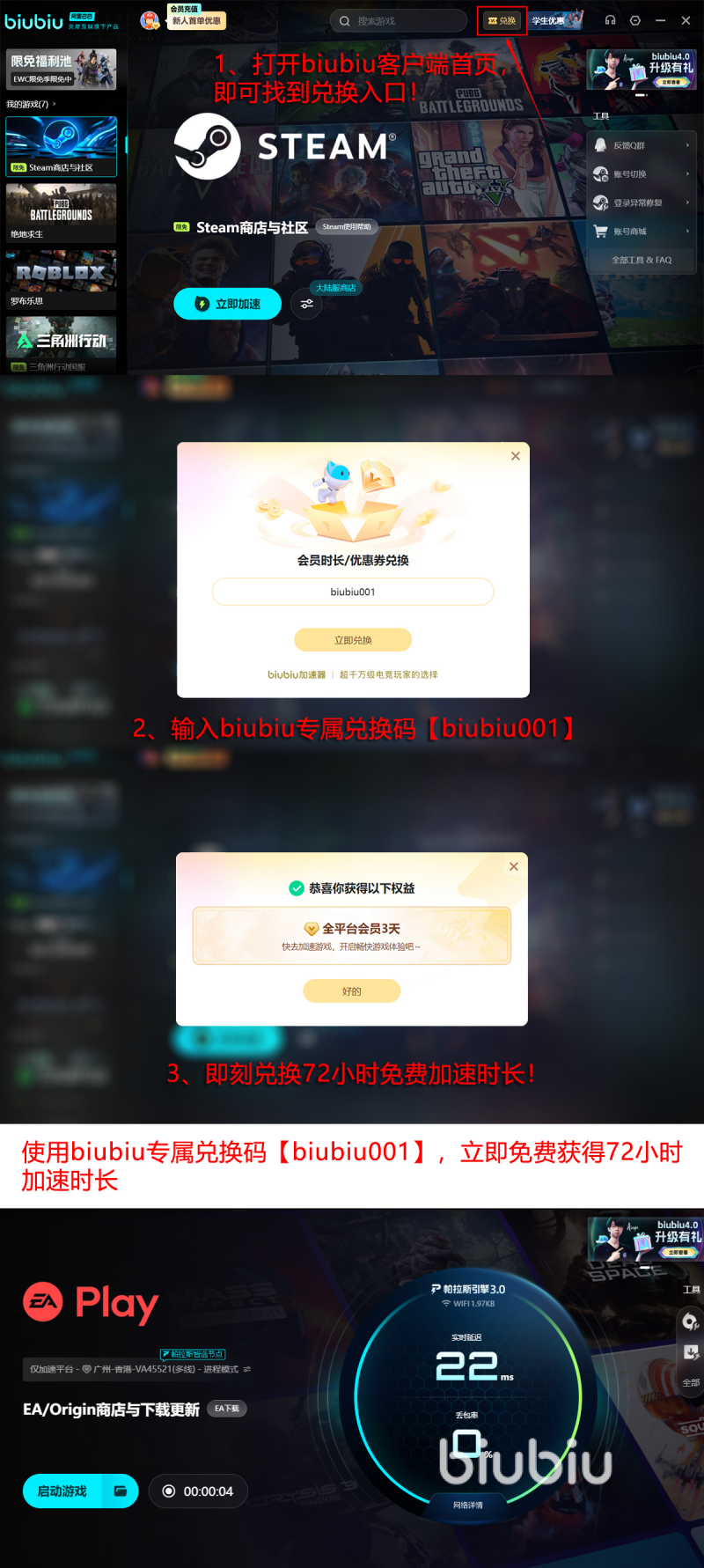 整体的界面以及操作的方式都特别简单,同时对于首次体验的人来说并不会需要首次使用时就充钱,那这样有可能会让大家踩雷,反而给大家提供了很多免费的福利。所有首次使用的人群就可以长达96小时,这么长时间的主要由来是有两种方式,一种就是第1次用账号激活之后就会拥有24小时的加速特权,而另一种就是用【biubiu001】再额外领取72小时的免费时长。