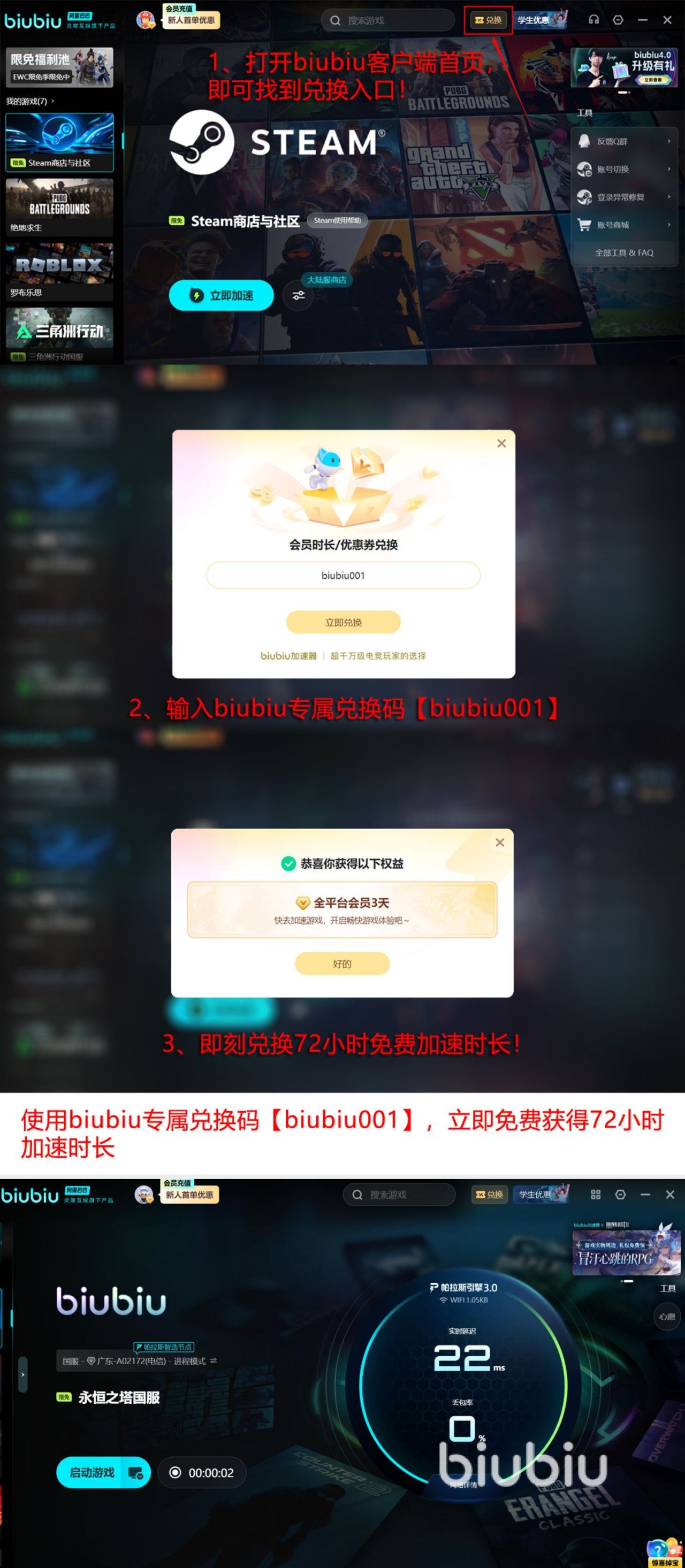 如果你害怕,并没有小编介绍的这样拥有激素效果,不用担心,我们可以使用官方推送的相关福利,只需点击链接,新用户即可获得24小时免费加速时长,所以有些老玩家使用兑换码【biubiu001】成功领取72小时免费加速福利,新用户有福了,将两种福利全部领取之后叠加至96小时,在加速的过程中能够以最大限度突破数据传输的堡垒。