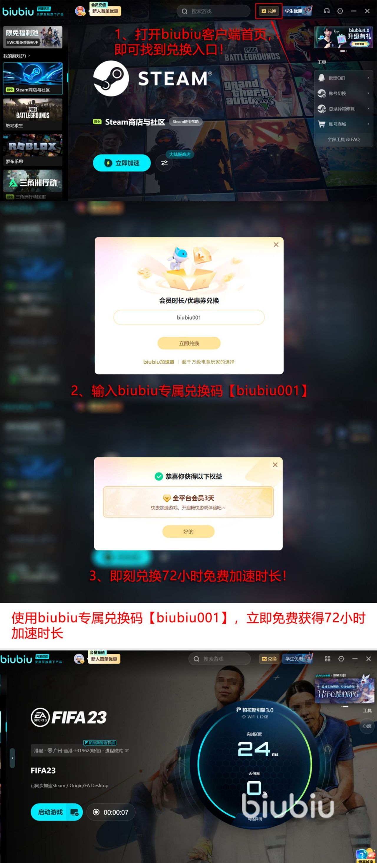 面向所有玩家都提供免费试用机会,零门槛无损失就可以使用,完成注册即可激活24小时全功能免费试用权限,输入专属口令【biubiu001】继续额外解锁72小时会员服务,此兑换活动全部人都能参与,新用户总计获得96小时高质量加速时长。