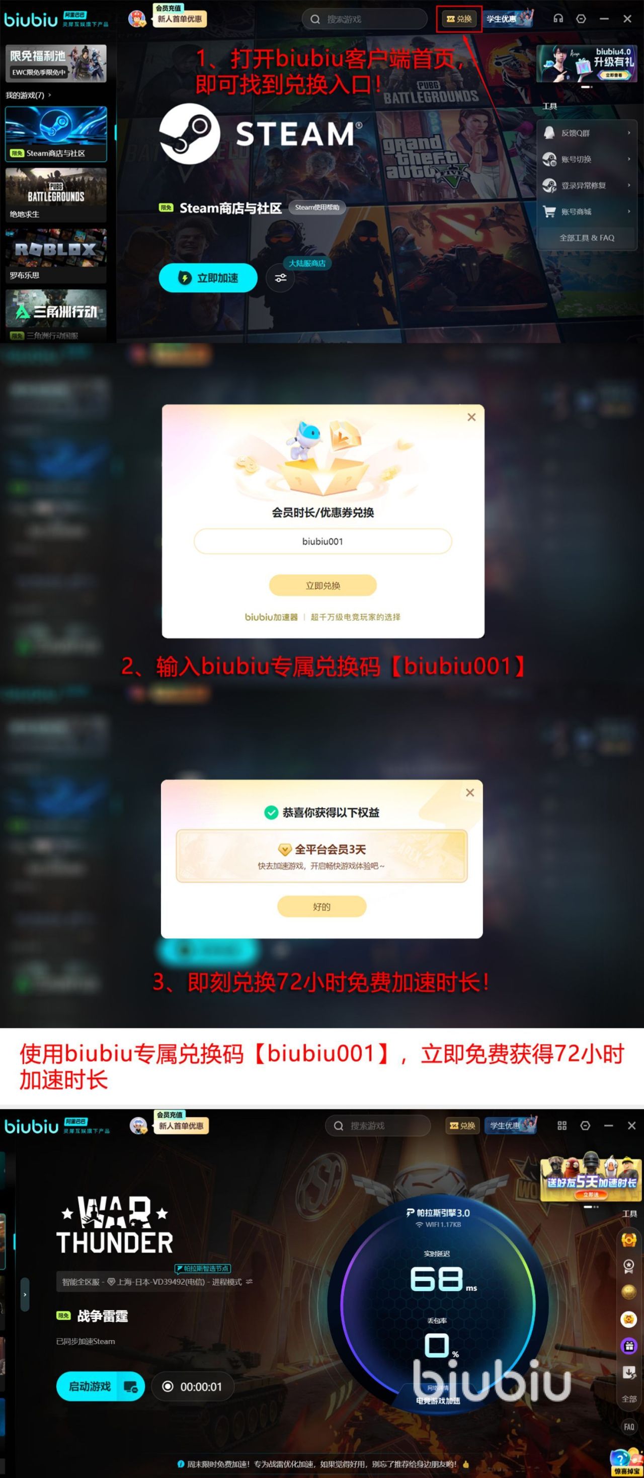 为了减少人们的种种顾虑,官方贴心的推送出一系列福利,也展现出独特的诚意,只需利用口令【biubiu001】即可成功获得72小时免费加速时长,长达三天的时间还可以在全平台当中任意搜索立即加速,如果你是刚注册的新用户,官方监测到个人账号信息,那么会额外赠送24小时免费加速福利,新用户能够领取长达96小时。