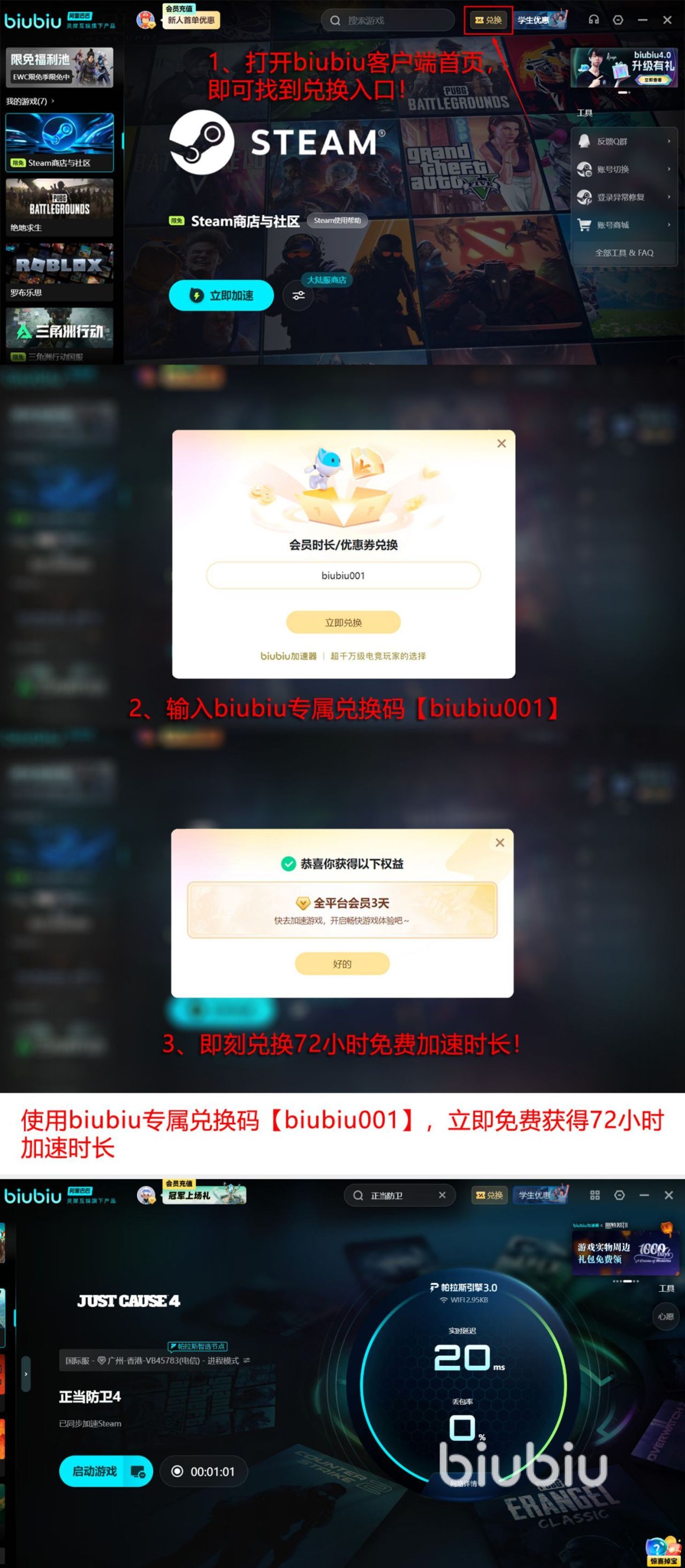 官方为了让所有人都有试用的机会,玩家可领取活动,注册账号,就能获得平台赠送的24小时免免费加速权益,还有另一项福利,所有人全部都可参与,使用【biubiu001】此口令即可额外获得长达三天的加速时长,新人将这两项福利全部领取,有机会叠加至96小时无门槛使用,试用之后觉得还不错,可以长期使用。