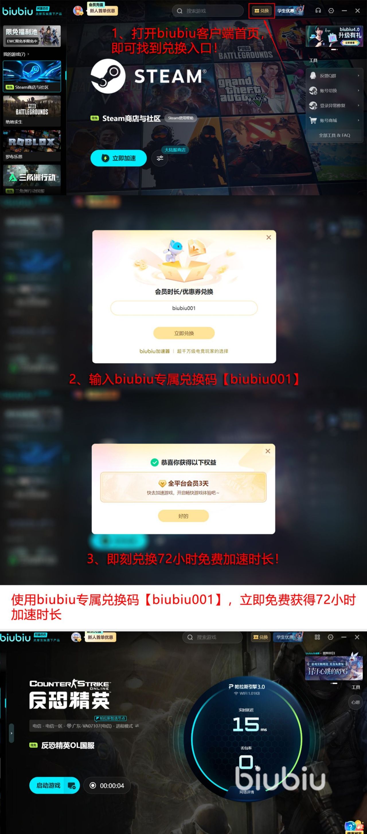 害怕具体的加速效果并没有想象的那么有效,不用担心,我们可以领取免费试用福利,所有用户全部都可参与,新用户点击链接下载,并不需要频繁设计,就能领取24小时免费加速时长,如果依旧意犹未尽,想要继续获得更长的免费体验时间,可以使用专属口令【biubiu001】继续领取长达三天的全平台加速,这是所有玩家全部都可参与到兑换活动,新用户能够将两种福利全部领取,叠加至96小时。